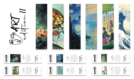 To już druga edycja zakładek z serii ART EDITION, która powstała z myślą o czytelnikach wyjątkowo czułych na piękno. Składa się na niego 6 wzorów z limitowanej edycji, a każdy z nich zdobi inne dzieło sztuki. Te obrazy umilą ci magiczny czas czytania: Jean-Honoré Fragonard - "Huśtawka" Paul Cézanne - "Kosz z jabłkami" Vincent van Gogh - "Gwieździsta noc" Claude Monet - " Impresja, wschód słońca" Georges Seurat - "Niedzielne popołudnie na wyspie La Grande Jatte” Katsushika Hokusai - "Wielka fala u wybrzeży Kanagawy" Zadecyduj, która z 6 wyjątkowych zakładek będzie ci towarzyszyła w nowej czytelniczej przygodzie. Jedno jest pewne – przerywanie lektury jeszcze nigdy nie było tak piękne! Pamiętaj, że zakładek nie sprzedajemy pojedynczo! Zamawiasz cały pakiet i dzielisz się zakładkami z bliskimi. Dzięki temu możesz na przykład podzielić się pakietem z przyjaciółmi i razem z nimi cieszyć oczy wyjątkowymi dziełami wybitnych malarzy. Ważne! Nakład pakietu ART EDITION II jest mocno ograniczony! Dlatego nie zwlekaj i złóż zamówienie już dzisiaj!