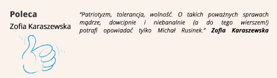 Rok 2018 był wyjątkowy dla Polaków - obchodziliśmy wtedy setną rocznicę odzyskania niepodległości. W szkole podstawowej, do której uczęszcza moja córka na wielu płaszczyznach pokazywano dzieciom jak ważny to dla nas czas. Poprzez uczestnictwo w konkursach uczniowie podkreślali rozumienie niepodległości. Dzięki jednej z nauczycielek nauczania początkowego, która organizowała konkurs recytatorski o tematyce patriotycznej poznałam książkę Michała Rusinka "Jaki znak Twój? Wierszyki na dalsze 100 lat niepodległości". Zresztą zawartość tak mi się spodobała podczas pobieżnego przejrzenia, że moja Ośmiolatka jednego z wierszyków nauczyła się do tegoż konkursu. Niebanalna okładka działa na nasz wzrok. W dłoniach czujemy twardą oprawę. A później rozpoczynamy cudowną podróż poprzez odpowiedzi na bardzo ważne dla nas, Polaków pytania. Dotychczas znaliśmy tylko wersję dziesięciu pytań Bełzy, teraz na topie będzie dziesiątka Rusinka :) Dlaczego? Ponieważ od chwili stworzenia przez Władysława Bełzę "Katechizmu polskiego dziecka" wiele się zmieniło. Owszem, odpowiedzi pozostają te same, ale otaczający świat a wraz z nim ludzie poddani zostali przemianom. Książeczka w sposób niezwykle przystępny udziela odpowiedzi na "Kto ty jesteś?", "Jaki znak twój?", "Gdzie ty mieszkasz?", "W jakim kraju?" i tak dalej... Brzmi znajomo, prawda? Jednak odpowiedzi u Rusinka są dłuższe, zabawniejsze, rymowane. Nie tylko szybko zapadają w pamięć, ale również sprawiają, że przedszkolaki czy uczniowie zrozumieją czym jest flaga, hymn, jaka jest nasza historia, czym jest dla nas Polska, Europa, świat. Chyba śmiało mogę nazwać książeczkę dziełem Rusinka, bowiem pomijając już nawet zdanie małoletnich, osobiście uważam, że jest przepiękna. Nie tylko graficznie, gdyż ilustracje przemawiają dosłownie i chwytają za serce, ale przede wszystkim z uwagi na przesłanie zawarte w tekście. A że autor nie postawił na sztywne regułki, lecz ton lekki, prosty i z humorem, dosyć szybko można z pamięci recytować fragmenty. Niezmiernie ucieszyła mnie propozycja od Wydawnictwa Znak a co za tym idzie szansa na posiadanie własnego egzemplarza - córka wygrała konkurs i książeczka wciąż zajmuje szczególne miejsce w jej czytelniczym życiu. Serdecznie Wam polecam sięgnięcie po tak wyjątkową pozycję patriotyczną. Książeczka otrzymała nagrodę literacką w konkursie Polskiej Sekcji IBBY "Książka Roku 2018"! Całkowicie się z tym zgadzam i gratuluję :) Jeśli chcesz zajrzeć do wnętrza zapraszam na bloga: https://czytelnicza-dusza.blogspot.com/2019/01/micha-rusinek-jaki-znak-twoj.html