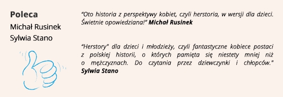Historia naszego kraju, o której uczyliśmy się i uczą nasze dzieci, to głównie historia mężczyzn. Wojów, królów, uczonych, wynalazców, lekarzy i polityków.Od czasu do czasu przemknie tu jakaś kobieta, ale jest ich stosunkowo niewiele, a i o części z nich nie wspomina się wcale.Na szczęście coraz częściej możemy sięgnąć po publikacje, które pokazują, że kobiety też wniosły wiele do historii Polski i świata, w różnych dziedzinach życia.Jedną z takich książek jest właśnie ta. Przepięknie wydana, opowiada o kobietach, które zapisały się na kartach historii będąc prekursorkami w swojej dziedzinie, wyznaczając nowe trendy lub dokonując ważnych rzeczy na równi z mężczyznami.Książka skierowana jest do dzieci, przez co opisy poszczególnych postaci są napisane w sposób, który właśnie dzieci zainteresuje. Bohaterki albo zwracają się bezpośrednio do czytelnika, opowiadając o sobie, albo są zwięźle i atrakcyjnie prezentowane przez narratora.Całości dopełniają ilustracje, a wśród nich portrety opisanych kobiet. Po każdym rodziale-biografii znajduje się kilka wyjaśnień zastosowanych w tekście terminów lub opis ważniejszych dla danego czasu lub postaci haseł.W książce znajdziecie opisy różnych kobiet - królowej, chirurga, himalaistki czy szpiega. Każda z nich inspiruje i uczy. Każda z nich pokazuje, że to nie płeć definiuje nasze możliwości, a jeśli tylko chcemy, możemy być kim chcemy.Ja bardzo polecam.