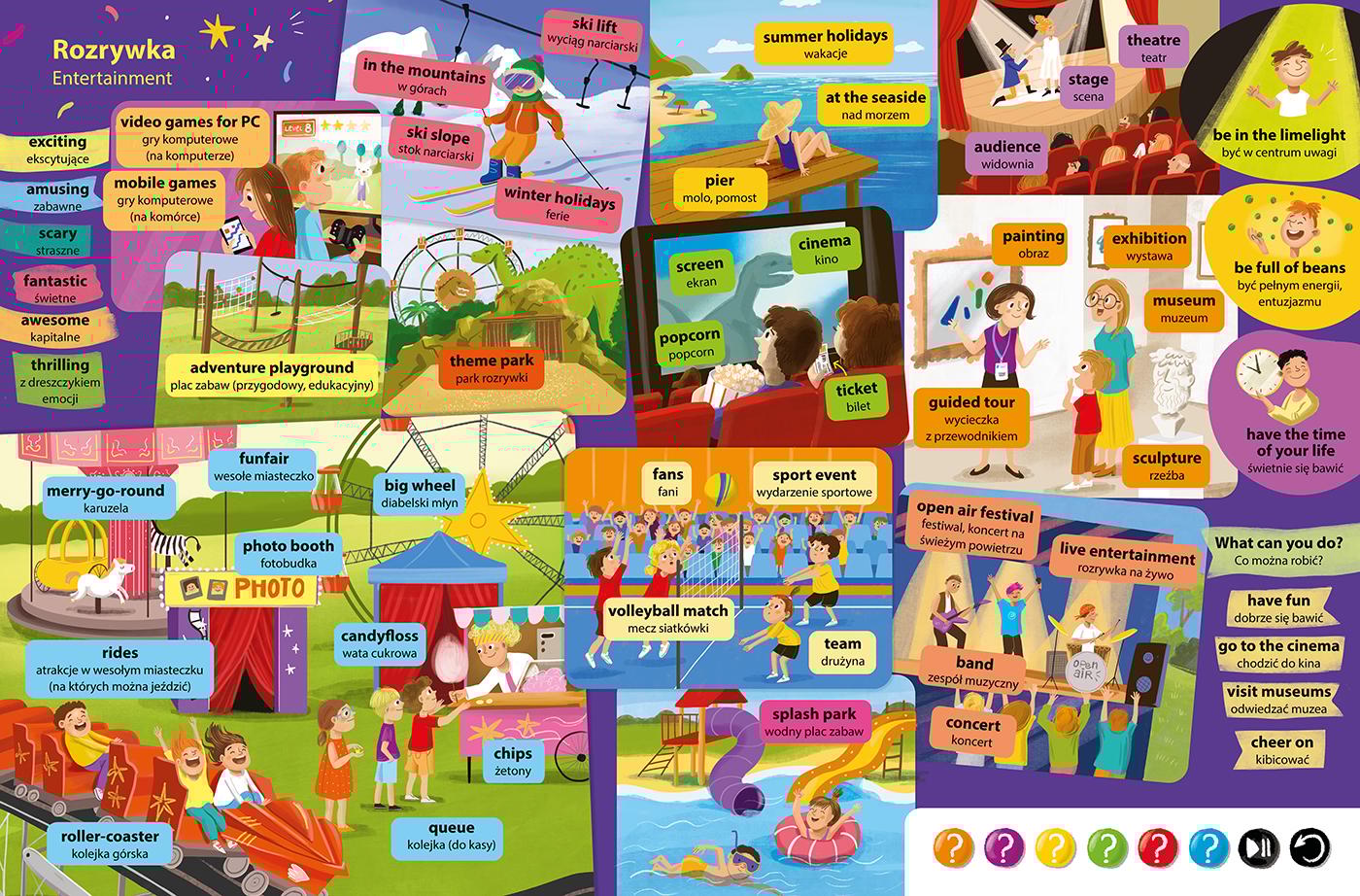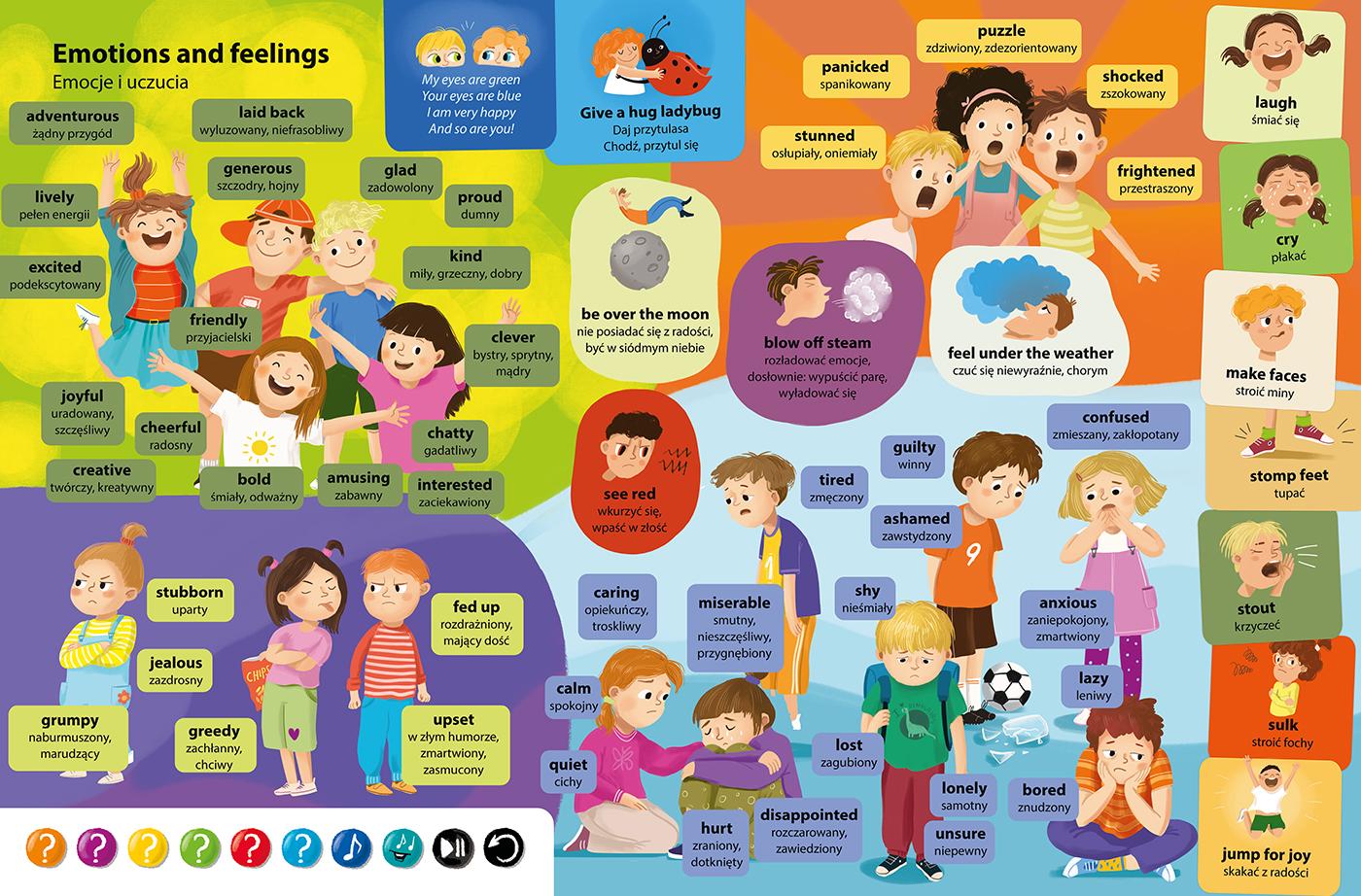 Młody czytelnik rozszerzy swój zasób słów i utrwali wymowę dzięki świetnej oprawie lektorskiej. Pełne humoru ilustracje Beaty Żurawskiej będą nieocenionym wsparciem podczas nauki. W tym interaktywnym słowniczku znajdują się także zabawne łamańce językowe, rymowanki, zagadki i piosenki. Umieszczone przy każdym temacie pytania i polecenia nie tylko rozwiną umiejętności rozumienia słuchanego tekstu, ale także dostarczą dzieciom zabawy oraz informacji o postępach w nauce języka angielskiego.