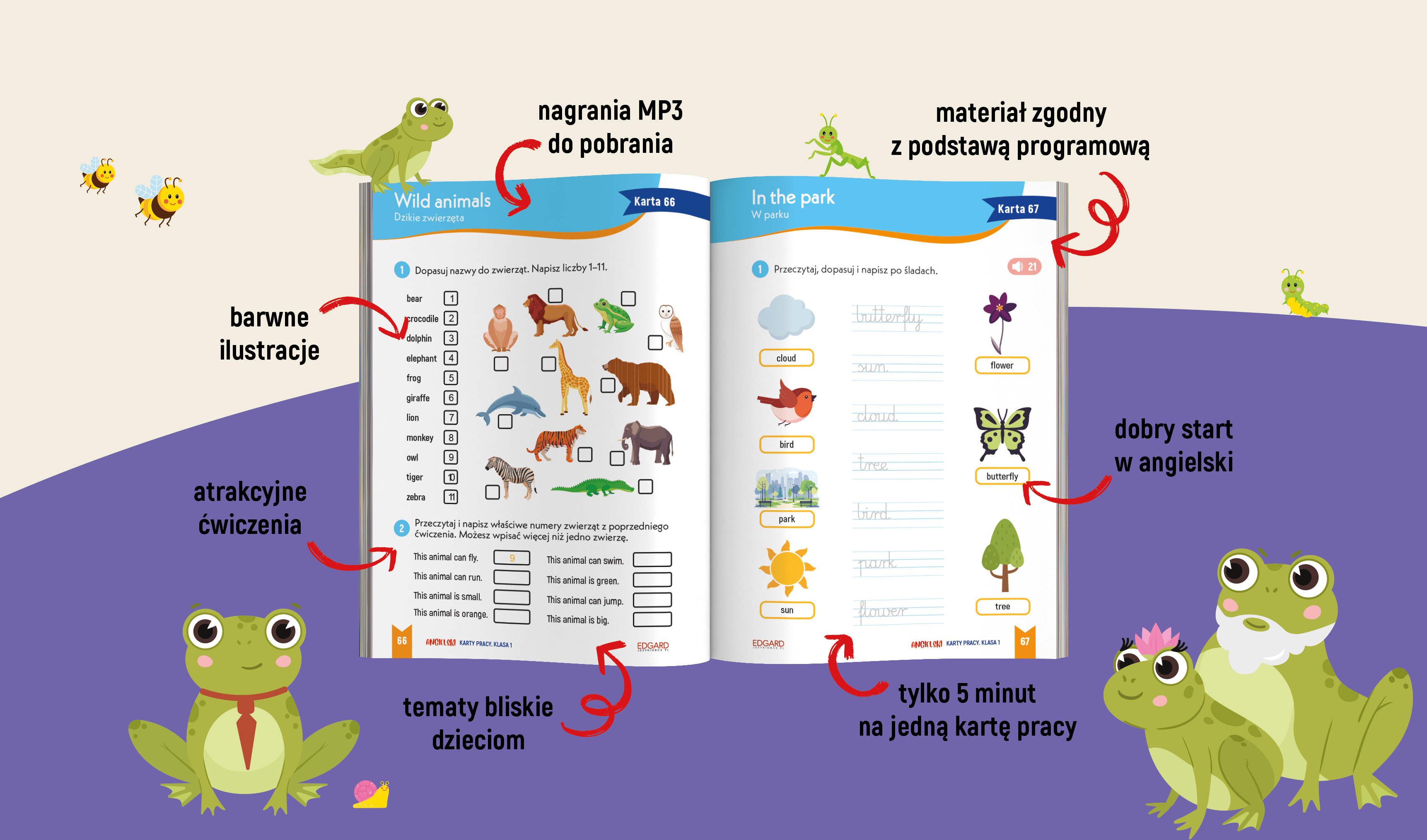 Już pierwszoklasiści mogą uczyć się angielskiego, nie tylko w szkole, ale też w domu. A ty możesz zadbać, by nauka przebiegała w sposób przyjemny, nie obciążający planu dnia, a jednocześnie skuteczny. Wystarczy tylko 5 minut i jedna karta pracy dziennie, by zaciekawić dziecko językiem angielskim, zbudować językową pewność siebie i wzmocnić jego poczucie własnej wartości w szkole i w życiu na lata.