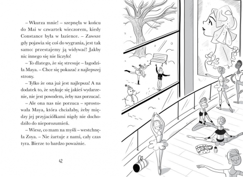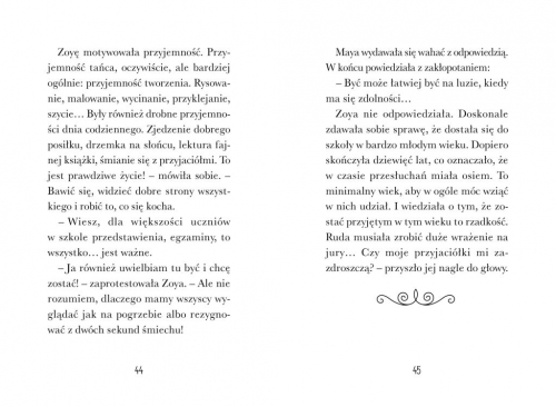 Ile razy zrobiłaś/- łeś coś żeby się dopasować?Nie wróciłaś z brudnymi kolanami z meczu, bo tak nie wypada dziewczynkom?Poszedłeś się siedzieć z chłopakami bawić się autami ze spojrzeniem tęsknie wpatrującym się w zabawkową kuchnię?Oddałaś swoją ulubioną zabawkę, bo "trzeba się dzielić"?Zrobiłeś coś dla zgrywy, a konsekwencje tego ponieśli także inni?Ten gryzący sweter otula nas szczelnie z niemal każdej strony, zmusza nas do bycia szarym, przykładnym i miłym. Sprawia to czasami, że dziecko nie mogąc odnaleźć się w świecie z tak wysokimi murami, gubi się, nie radzi sobie, czasami się buntuje.Zoya nie potrafi i nie chce być wzorową uczennicą z elitarnej paryskiej szkoły baletowej. Właśnie- elitarnej- czy jest więc w niej miejsce dla nieposkromionego rudzielca? Zoya to dusza towarzystwa, osoba nieustannie żartująca, wymyślająca coraz to nowe szalone pomysły nie myśląc o konsekwencjach. Dziewczyna nie zastanawia się nad skutkami swojego zachowania nawet wtedy, kiedy szansa spełnienia jej ogromnego marzenia jest na wyciągnięcie point... A przyjaciele przestrzegają ją przed zbliżającą się granicą, której przekroczenie może być dla rudowłosej dziewczyny dotkliwe.Kiedy Zoi zdaje się, że wszyscy są przeciwko niej, nawet przyjaciele, którym zaczęło przeszkadzać jej buntownicze (czasami nawet błazeńskie) zachowanie, rodzi się w niej złość, z którą nie potrafi sobie poradzić i finalnie tak też się staje. Co z występem w Operze Garniera? Co z jej dalszym losem w Szkole Tańca Opery Paryskiej? I w końcu, co z jej paczką przyjaciół?To książka o przyjaźni, o empatii, a także o podążaniu za marzeniami. Dopiero na końcu jest to dla mnie książka o balecie, wokół niego wszystko w tej książce oscyluje, wokół życia w szkole baletowej. Zaś przede wszystkim to książka o odwadze bycia sobą, tak jak zaznaczyłam na wstępie, ale także o poczuciu odpowiedzialności za swoje zachowanie, o przewidywaniu jego konsekwencji, w końcu o takim złotym środku. Czymś pomiędzy byciem stłamszonym a przekraczaniem granic, również granic innych osób. Ten środek to dla mnie dbanie o siebie jako jednostkę, pamiętając o tym, że jest się członkiem społeczeństwa, także poprzez poprzez dostrzeganie innych, empatię. Zatem choć ta historia rozgrywa się w paryskiej szkole baletowej przystaje do problemów dzieci w polskiej rzeczywistości, w polskiej szkole i codzienności.Oprócz waloru edukacyjnego, jaki niezaprzeczalnie ta książka posiada, zwróciłam również uwagę na dużą czcionkę, która sprawia, iż lekturę dobrze będzie się czytało młodym czytelnikom. Całości dopełniają piękne czarno-białe ilustracje, czasem minimalistyczne acz pełne finezji.Recenzja na profilu IG _ksiazkowanie_