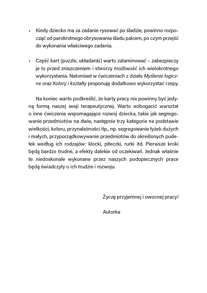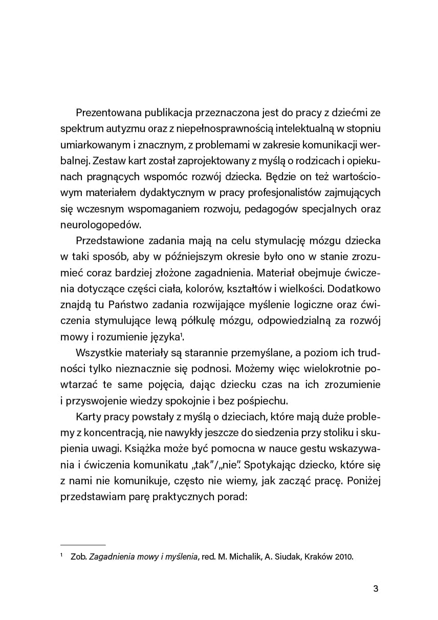 Publikacja przeznaczona jest do pracy z dziećmi ze spektrum autyzmu oraz z niepełnosprawnością intelektualną w stopniu umiarkowanym i znacznym, z problemami w zakresie komunikacji werbalnej.