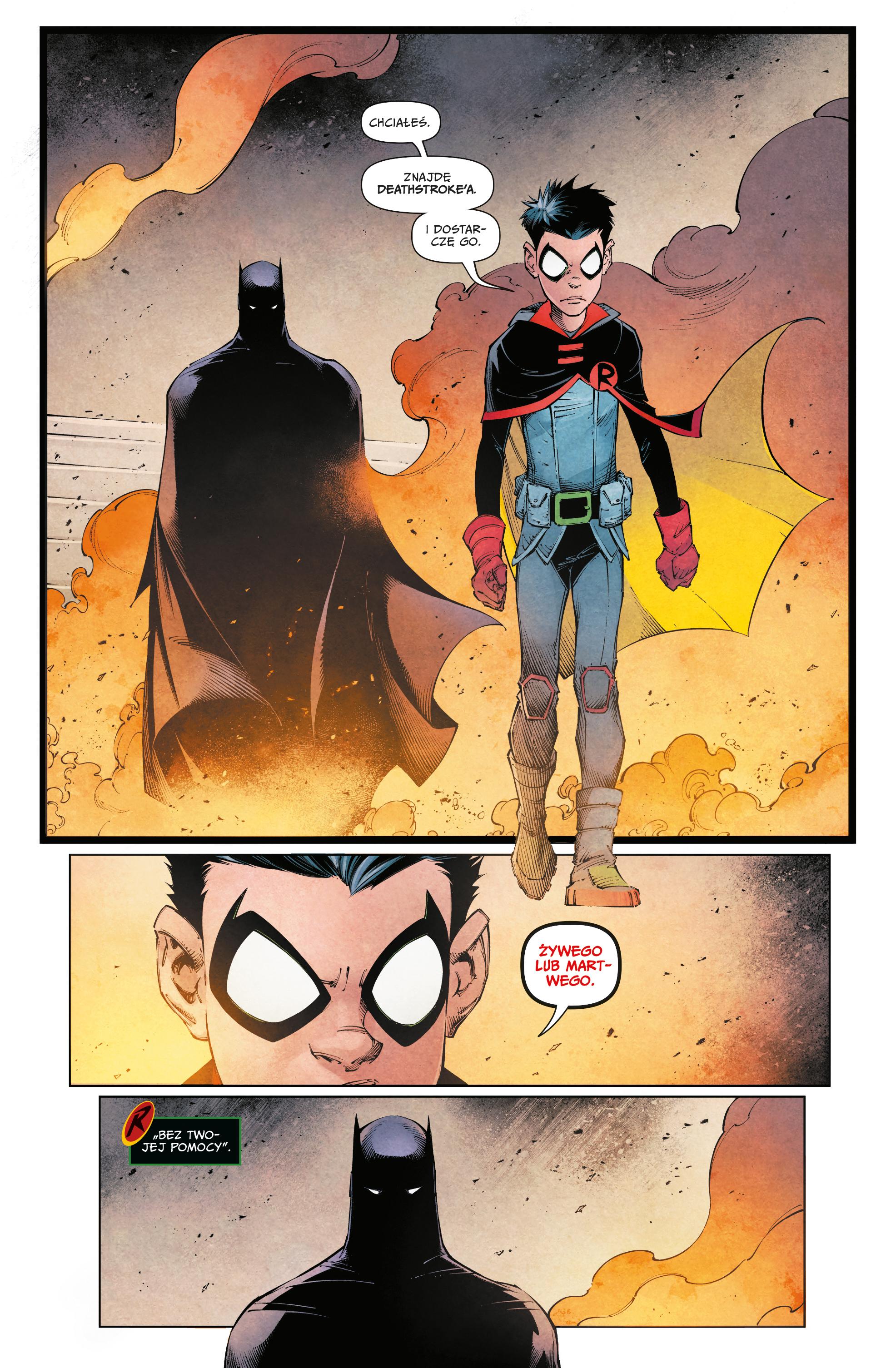 Gdy Ra’s Al-Ghul ginie z ręki Deathstroke’a, Talia Al-Ghul postanawia pomścić śmierć ojca i wysyła Ligę Cieni, aby zlikwidowała Slade’a Wilsona i wszystkie osoby z nim związane! Czy Batman i Robin zdążą odnaleźć Deathstroke’a i doprowadzić go przed wymiar sprawiedliwości... zanim Slade i Talia pozabija się nawzajem. I komu zależy, żeby tak się stało? Ten wielowątkowy crossover pełen starć, akcji, tajemnic i zdrady nie pozostanie bez wpływu na świat DC! Scenarzysta Joshua Williamson wraz z najlepszymi rysownikami, wśród których znaleźli się między innymi: Howard Porter, Roger Cruz, Paolo Pantalena, Viktor Bogdanovic i Stephen Segovia, przedstawiają epicką opowieść, która prowadzi do kolejnego rozdziału historii uniwersum DC – eventu „Mroczny kryzys na nieskończonych ziemiach”. Album zawiera materiały opublikowane pierwotnie w amerykańskich zeszytach: „Shadow War: Alpha“ #1, „Batman” #122-123, „Deathstroke Inc.” #7-9, „Robin” #13-15, „Shadow War Zone” #1 oraz „Shadow War: Omega” #1.Szczegółowe informacje na temat książki Batman Wojna cieni