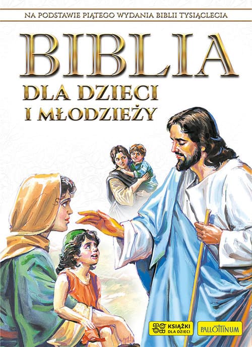 BIBLIA DLA DZIECI I MŁODZIEŻY to najnowsze wydanie książki BIBLIA DLA DZIECI, która w przystępnej i bogato ilustrowanej formie przekazuje historię zbawienia i tajemnicę paschalną. Wybrane teksty zaczerpnięte ze Starego i Nowego Testamentu wprowadzają młodego Czytelnika w biblijny świat. Są tu oryginalne fragmenty Słowa Bożego, spisanego pod natchnieniem Ducha Świętego. Ich lektura staje się osobistym spotkaniem z Bogiem i pomaga formować serca i sumienia w duchu prawdy i miłości ewangelicznej. Książka została przygotowana we współpracy z WYDAWNICTWEM PALLOTTINUM. Teksty zaczerpnięto z Biblii Tysiąclecia, która stanowi oficjalny przekład Pisma Świętego, używany w Kościele katolickim w Polsce.