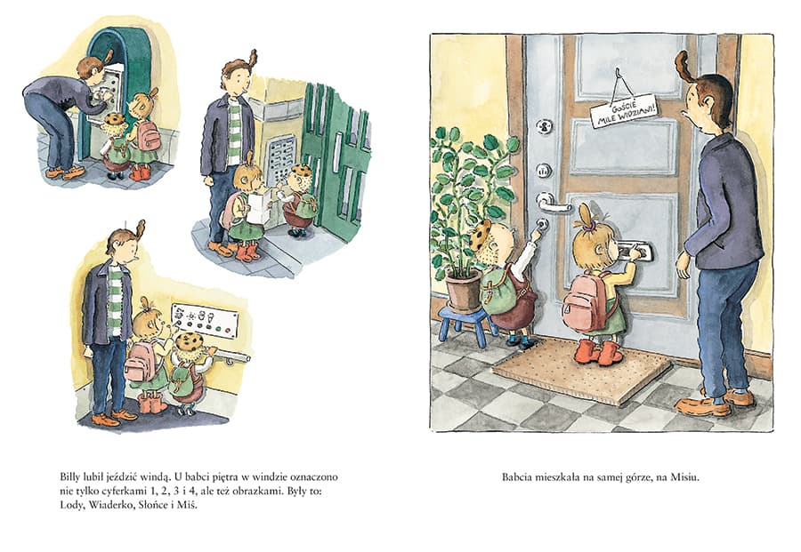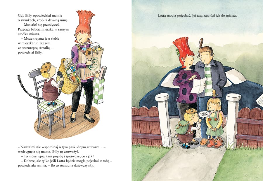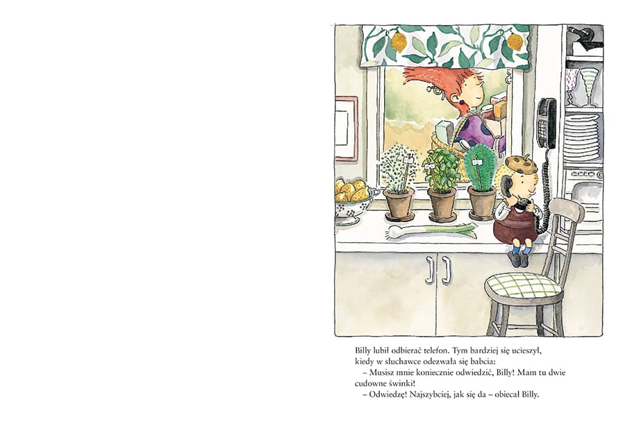 "Babcia Billy’ego uwielbia zwierzęta i chociaż mieszka w samym środku miasta, właśnie sprawiła sobie dwie świnki. Billy z Lottą jadą je zobaczyć. Świnki budzą spore zainteresowanie w okolicy. Wszyscy chcą je nakarmić i pogłaskać, zwłaszcza dzieci. Ale przy domku świnek zaczynają się też kręcić podejrzane typki… Wydawnictwo Zakamarki wznawia serię o Billym publikowaną niegdyś przez inną oficynę. Niezwykle zabawne i świetnie zilustrowane historie z życia tego kilkuletniego chłopca zyskały sympatię czytelników, dlatego Billy powraca – wypatrujcie zarówno nowych, jak i starych tytułów! Polecamy również: „Billy i dziwny dzień”. "