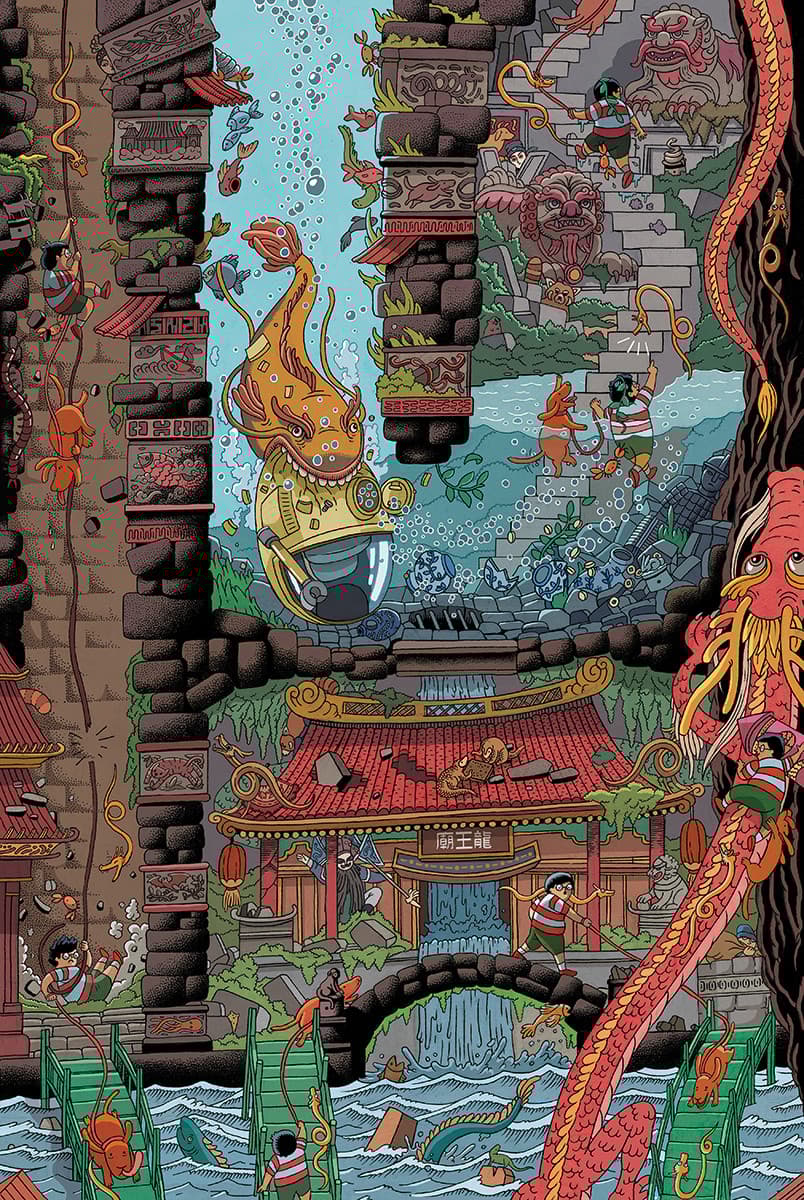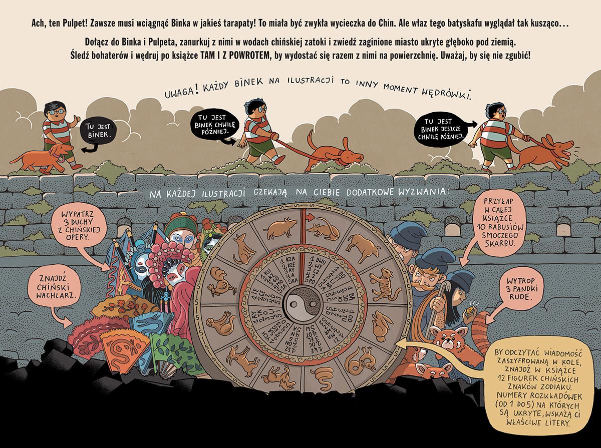 Pomysłowa książka-gra dla spostrzegawczych. Drugi tom przygód Binka i jego psa Pulpeta. Ach, ten Pulpet! Zawsze musi wciągnąć Binka w jakieś tarapaty! To miała być zwykła wycieczka do Chin. Ale właz tego batyskafu wyglądał tak kusząco... Dołącz do Binka i Pulpeta, zanurkuj z nimi w chińskich głębinach i zwiedź zaginione miasto ukryte głęboko pod ziemią. Śledź bohaterów i wędruj po książce TAM I Z POWROTEM, by wydostać się razem z nimi na powierzchnię. Uważaj, by się nie zgubić! Książka obrazkowa pomysłowo wykorzystująca architekturę książki. Przemierzając wraz z bohaterami zakamarki podziemnego miasta, dzieci szukają właściwej drogi przez kolejne strony książki. Nim trafią do wyjścia, będą musiały kilkakrotnie przemierzyć ją w tę i z powrotem, a po drodze wypatrzeć ukryte szczegóły i rozwiązać zaszyfrowane zagadki.Szczegółowe informacje na temat książki Binek i Pulpet w królestwie chińskiego smoka