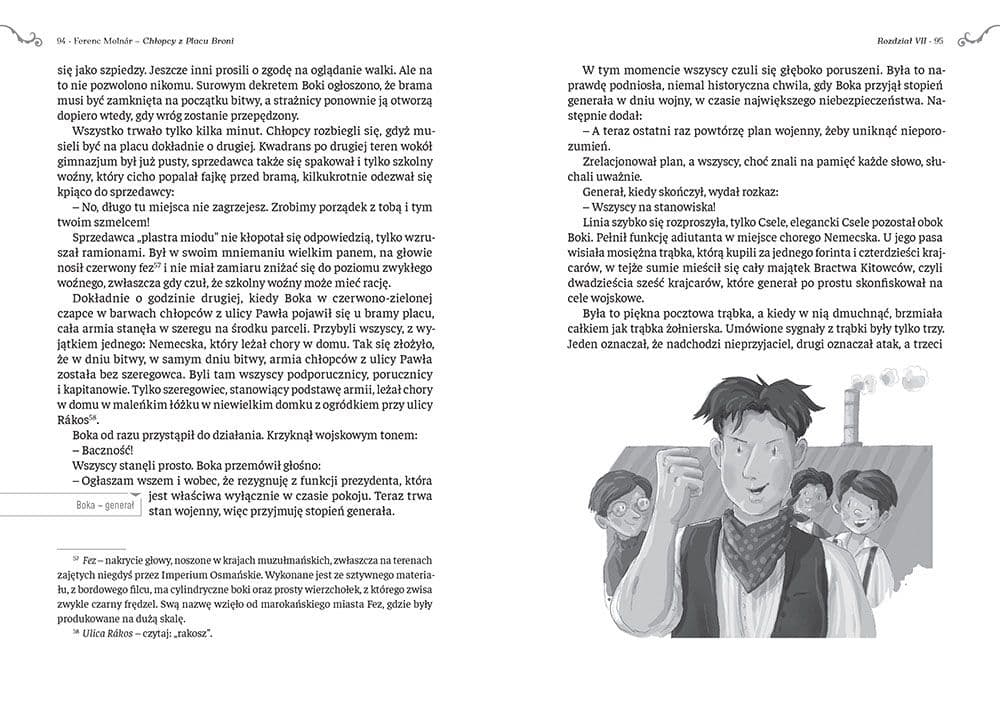 „Chłopcy z Placu Broni” Ferenca Molnára to ponadczasowa i wyjątkowa opowieść, która od pokoleń trafia do serc uczniów. Książka przedstawia historię grupy szkolnych przyjaciół z ulicy Pawła, których całym światem staje się pewien niezagospodarowany budapeszteński plac. To miejsce jest dla nich symbolem wolności, tożsamości i idei, której przysięgli bronić. Chłopcy mieli swojego przywódcę – Bokę, stopnie wojskowe oraz surowy, żołnierski kodeks moralny.Wśród nich wyróżniał się Nemeczek, drobny i nieśmiały szeregowiec, w którym drzemał ogromny potencjał. Spokój ich małej społeczności został zakłócony przez Czerwone Koszule, grupę chłopców z Ogrodu Botanicznego, pod dowództwem Feriego Átsa. Wrogowie postanowili zdobyć plac – wybuchła wojna, która stała się sprawdzianem przyjaźni i poświęcenia.