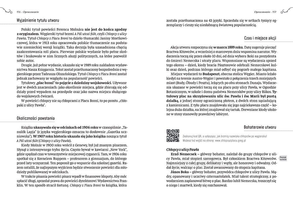 Wydanie Chłopców z Placu Broni kompletne bez skrótów i cięć w treści. W tym wydaniu znajdziesz odpowiedzi na pytania z podręcznika - „pewniak na teście”, czyli wskazanie zagadnień, które zwykle pojawiają się w pytaniach z danej lektury we wszelkich testach sprawdzających wiedzę, a także w podręcznikach i na klasówkach. Książka zawiera pełen tekst lektury. Na końcu książki zamieszczono opracowanie, w którym znajduje się bardzo szczegółowe streszczenie oraz drugie skrócone, ułatwiające szybkie przygotowanie się przed lekcją. Opracowanie zawiera ponadto plan wydarzeń, wnikliwie wyjaśnioną problematykę oraz szerokie charakterystyki bohaterów. Chłopcy z Placu Broni to książka czytana z zapałem przez wiele pokoleń uczniów. To wyjątkowa opowieść o przyjaźni, poświęceniu w imię idei i niezwykłym przywiązaniu do pewnego niezagospodarowanego budapeszteńskiego placu. Grupa chłopców, szkolnych przyjaciół, spotykała się regularnie w ulubionym miejscu. Mieli przywódcę, Bokę, stopnie wojskowe i prawdziwie żołnierski kodeks moralny. Wśród nich był Nemecsek - niepozorny szeregowiec, drobny i nieśmiały, w którym drzemał ogromny potencjał. Spokój chłopaków z ulicy Pawła zmąciły Czerwone Koszule, grupa chłopców z Ogrodu Botanicznego. Wrogowie, pod wodzą Feriego Átsa, postanowili zdobyć plac - wybuchła wojna... Kto okazał się prawdziwym bohaterem? Kto wygrał? Wydanie Chłopców z Placu Broni od Wydawnictwa Greg to nie tylko nowe tłumaczenie i rzetelne opracowanie, ale także wyjątkowe ilustracje Mikołaja Kamlera. Książkę wyróżnia oryginalny zapis imion, nazwisk i nazw miejscowych oraz towarzyszące mu przypisy z zapisem wymowy, a także nagrania dostępne online, dzięki którym można usłyszeć, jak nazwy własne brzmią po węgiersku. Zapraszamy do lektury!Klasyka literatury: o przyjaźni i honorze