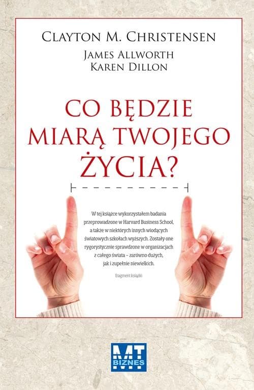Jeśli jesteś studentem zarządzania i nauk pokrewnych, ekonomistą, biznesmenem lub teoretykiem biznesu, ta książka pozwoli ci spojrzeć z innej strony na bezduszna wiedzę i teorie. Przeczytaj uważnie to, czy jeden z największych specjalistów w branży ma do powiedzenia i przekonaj się, że na życie też trzeba mieć strategię. Jeden z wiodących światowych teoretyków innowacyjności, autor bestsellera Przełomowe innowacje, proponuje niekonwencjonalną książkę o inspiracji i mądrości, które mogą stać się fundamentami spełnionego życia. W 2010 r. światowej sławy ekspert zajmujący się innowacyjnością Clayton M. Christensen wygłosił inspirujące przemówienie dla studentów ostatniego roku Harvard Business School. Opierając się na prowadzonych analizach sytuacji przedsiębiorstw, zaoferował szereg wskazówek, które mogą pomóc w odnalezieniu znaczenia i szczęścia w życiu. Posłużył się przykładami z własnego doświadczenia, aby wyjaśnić, dlaczego ludzie sukcesu aż nazbyt często wpadają w pułapki prowadzące do nieszczęścia. Przemówienie zapadło słuchaczom w pamięć nie tylko dlatego, że było bardzo treściwe, lecz również dlatego, że Christensen wygłaszał je wkrótce po tym, jak życie zmusiło go do poważnej, osobistej refleksji – właśnie przezwyciężył takiego samego raka, jaki odebrał życie jego ojcu. Gdy zmagał się z chorobą, pytanie „Co będzie miarą twojego życia?” stawało się coraz bardziej naglące i dokuczliwe – w pewnym momencie zaczął dzielić się przemyśleniami z rodziną, przyjaciółmi i studentami. W tej przełomowej książce Christensen stawia szereg pytań: Jak mogę się upewnić, że moja droga zawodowa przyniesie mi satysfakcję? Skąd będę wiedzieć, że moje osobiste relacje staną się trwałymi źródłami szczęścia? Jak mogę uniknąć nieuczciwego postępowania i nie dać się wtrącić do więzienia? Posługując się przykładami z najwspanialszych firm świata, autor przedstawia niezwykle trafne odpowiedzi na te trudne pytania. „Co będzie miarą twojego życia?” to pełna inspiracji i mądrości książka, która pomoże studentom, pnącym się po szczeblach kariery profesjonalistom i rodzicom w znalezieniu własnych ścieżek do życiowego spełnienia.