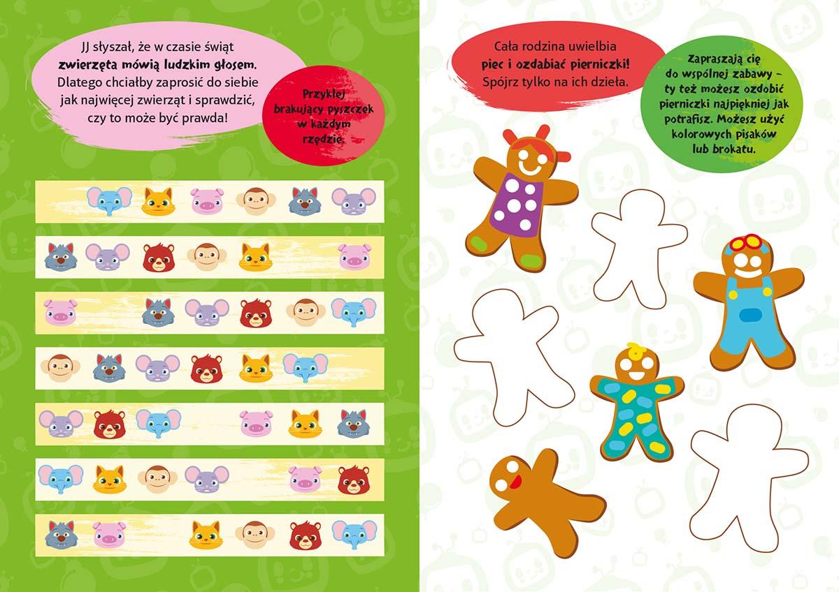 CoComelon zaprasza na wspaniałą zimową zabawę z ulubionymi bohaterami. W książeczce ze śnieżnymi zadaniami J.J., jego rodzina i przyjaciele z przedszkola zabiorą was w świat mroźnych przygód. Sprawdź, kto ulepił największego bałwana i czego w zimie wypatruje za oknem TomTom. Razem z bohaterami szusuj na nartach a potem narysuj niepowtarzalny płatek śniegu! Wypełniona prostymi łamigłówkami, zagadkami i kolorowankami książka pomoże dziecku doskonalić koordynację ręka-oko, ćwiczyć małą motorykę i rozpoznawanie kolorów a wesołe naklejki ułatwią rozwiązywanie zadań dostosowanych do wieku maluchów. Zimowy zeszyt zadań CoComelon to najmilszy sposób na wspólne spędzanie z dzieckiem nie tylko świątecznych i zimowych wieczorów!
