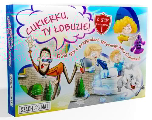 Gra „Cukierku, Ty łobuzie!” opiera się na serii książek dla dzieci Waldemara Cichonia, z której pierwsza część o takim właśnie tytule znajduje się w kanonie lektur szkolnych dla klas I-III. Uwielbiana przez dzieci i dorosłych zabawna seria o psotach i figlach Cukierka i jego wcale nie mniej zabawnej rodzinki wreszcie pojawia się w formie gry planszowej! Cukierek od samego początku stał się dla dzieci niezwykle bliski i teraz w końcu same będą mogły zmierzyć się z ich ukochanym pupilem! W pudełku znajdują się dwie gry, zapełnione barwnymi obrazkami, które przedstawiają scenki z życia kota. Są to znane już ilustracje z książki. Dzięki prostym zasadom gry można z łatwością nauczyć gry swoich przyjaciół i zagrać wspólnie z tymi, którzy jakimś cudem jeszcze dotąd go nie poznali! Dodatkowo, mnóstwo zabawnych żetonów oraz spersonalizowana, oryginalna kostka z rysunkiem kota i człowieka sprawia, że chce się grać na okrągło! Gry są z pozoru proste, ale nie dajcie się zwieść… Pamiętajcie, wyścig z kotem, zawsze, kiedy już się zacznie, trwa do samego końca! Dwie gry planszowe, mnóstwo kolorowych żetonów i pionki Postaci, unikatowe kostki z ikonami Kota i jego właściciela oraz dodatkowa plansza Sweterka – to wszystko sprawia, że w grze nie brakuje emocji, a przygoda z Cukierkiem jest niezwykle wesoła i kolorowa! Zagrajcie i przekonajcie się, ile wspaniałej zabawy zapewni Wam Cukierek! Ah, ten Cukierek, jest naprawdę wyjątkowy, bo choć same z nim kłopoty, wzbudza przy tym tyle radości, że nie sposób go nie pokochać! Prawda, Cukierku? Miau… Zawartość pudełka: • plansza „Cukierku, Ty łobuzie!” • plansza „Złapię cię, Cukierku!” • plansza Sweterka • 41 żetonów (bonusy i psikusy) • 3 kostki • 4 pionki Rodziny • pionek kota • instrukcja