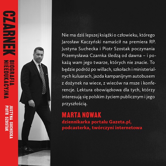 To nie jest tylko opowieść o szeregowym ministrze. To portret człowieka, który ma szansę rządzić całym krajem. Czy Przemysław Czarnek może stać się premierem Polski? Czas pokaże, jak rozwinie się w tym przypadku sytuacja na rodzimej scenie politycznej i jak będą wyglądać nastroje społeczne na czas wyborów parlamentarnych w 2027 roku. Bez wątpienia jednak książka Justyny Sucheckiej i Piotra Szostaka zagląda głęboko w jego ambicje i pokazuje, jak może wyglądać przyszłość polskiej prawicy.