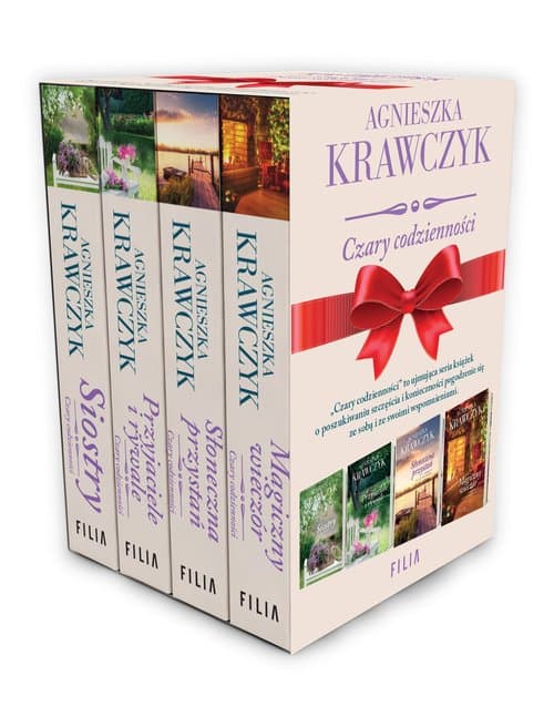 "Czary codzienności", bestsellerowa saga Agnieszki Krawczyk! Cztery tomy: "Siostry", "Przyjaciele i rywale", "Słoneczna przystań" i „Magiczny wieczór” w jednym pakiecie. Niech uwiodą was czary codzienności zaklęte w magii górskiego miasteczka, położonego wśród lasów i pachnących kwiatami łąk. Piękna saga o małym, górskim miasteczku, jego mieszkańcach i marzeniach, które, jeśli bardzo tego chcemy, mogą się spełnić.
