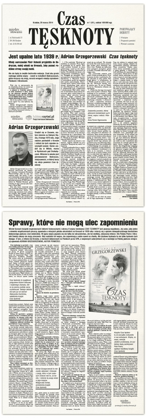 Książka Adriana Grzegorzewskiego to książka o tęsknocie, strachu, miłości, cierpieniu, ale również o czasie. Akcja rozgrywa się w czasie wojny, gdzie ujście z życiem niekiedy staje się cudem, a spotkanie z ukochaną osobą marzeniem. Bohaterowie żyją w ciągłym strachu i cierpieniu. Tęsknią i czekają. Ta książka idealnie wpisuje się w klimat jaki teraz panuje pomiędzy Ukrainą i Polską. Pozwala spojrzeć na wszystko z boku i skłania do refleksji. Czas tęsknoty to nie tylko romans dwóch postaci o różnych narodowościach, które ich rozdzieliły, to także powieść o tym co w życiu ważne, o co należy walczyć. Książka uświadamia nam, ile musieli poświęcić polscy żołnierze i uzmysławiają nam, czym jest prawdziwy patriotyzm, a przy tym uczy nas historii.