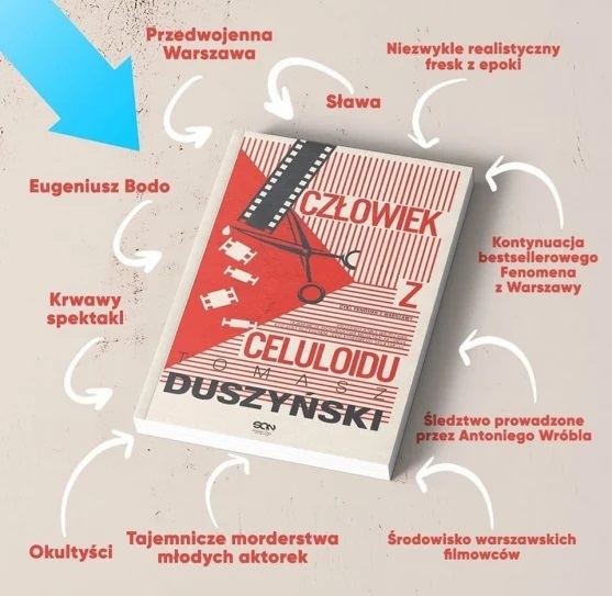 Ta niedziela – odwrotnie niż w piosence Mieczysława Fogga – wcale nie miała być dla nich ostatnia. Młode aktorki w przedwojennej Warszawie marzyły tylko o sławie na srebrnym ekranie. Zamiast tego znaleziono je martwe w zamkniętym atelier. Fragmenty nagranych pokątnie filmów z ich udziałem zapowiadają dalsze zbrodnie. Ślady prowadzą do okultystów – i coraz głębiej w przedwojenne środowisko warszawskich filmowców. Ile poświęcisz, żeby stać się gwiazdą? W śledztwie komisarzowi Wróblowi pomaga Antoni Słonimski, jednym z podejrzanych jest Eugeniusz Bodo, a w tle przewija się cały korowód barwnych postaci tych czasów. Kto jest reżyserem krwawego spektaklu, który wstrząsa mieszkańcami stolicy? Wszystko wskazuje na to, że niezależnie od wyniku śledztwa dla Antoniego Wróbla może to być ostatnie dochodzenie. Człowiek z Celuloidu Tomasza Duszyńskiego to kontynuacja bestsellerowego Fenomena z Warszawy i niezwykle realistyczny fresk z epoki, w której życie elit miesza się z historiami prosto z gangsterskiego półświatka i szczegółami biografii przedwojennych celebrytów! Komisarz Antoni Wróbel miał często do czynienia ze śmiercią. Czasem była to śmierć zwykła, ot, o most zaczepiło się napuchnięte niczym balon ciało samobójcy; czasem śmierć głupia i niepotrzebna, gdy grupa pijanych zabawowiczów przebiła samochodem barierkę i skończyła życie w nurtach Wisły. Pojawiały się jednak i inne sprawy, których okrucieństwo trudno było pojąć. Poćwiartowane zwłoki w walizce, ciało dziecka zatopione w szambie, zwłoki małżeństwa, torturowanego i zaszlachtowanego z powodu kilkudziesięciu złotych ukrytych pod materacem. Czy zdarzały się wśród nich sprawy jak ta ostatnia? Siedem ofiar w atelier „Sfinksa” i kolejna ofiara, której okrutna śmierć tak wyraźnie połączona była z poprzednimi? Niewątpliwie był to ciąg zaplanowanych, następujących po sobie wydarzeń. Przeprowadzonych z precyzją, a do tego sugerujących, że liczyć się trzeba z dalszym ciągiem tej popapranej historii. Z takim dochodzeniem komisarz jeszcze nie miał do czynienia.