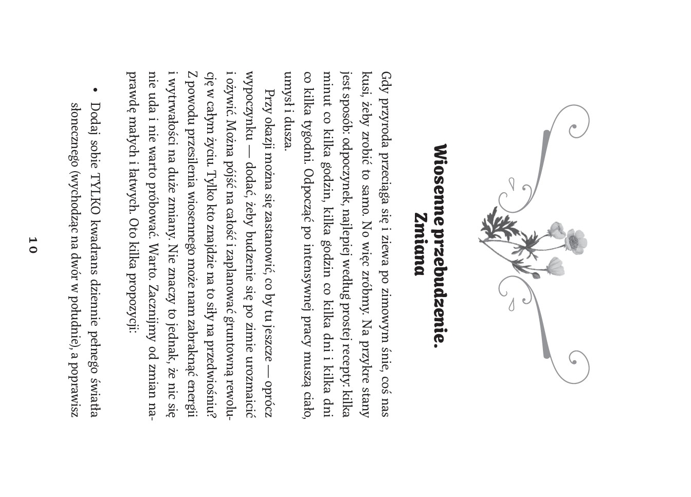 Zdarza Wam się spojrzeć na okładkę i od razu poczuć pozytywne emocje? Wręcz ciepło w sercu i to wewnętrzne przekonanie, że ta książka jest napisana właśnie dla Was? Mnie wystarczył rzut oka na ten graficzny majstersztyk, by poczuć radość z nadchodzącej wiosny. I jak tu nie oceniać książki po okładce? Wiedziałam jednak, że ta piękność (spójrzcie tylko na te barwione brzegi) nie będzie tylko ozdobą biblioteczki, ale przede wszystkim spotkaniem z mądrą kobietą, która o ludzkiej duszy wie niemal wszystko. Ewa Woydyłło, jedna z najbardziej cenionych polskich psycholożek i terapeutek, to dla mnie prawdziwa kobieta-rakieta! Pełna energii, błyskotliwego humoru i, co najważniejsze, niesamowitego zdrowego rozsądku. Nie zmusza nas do robienia życiowej rewolucji na przedwiośniu, kiedy ledwo powłóczymy nogami po długiej zimie. Zamiast tego uczy nas zmian metodą małych kroków, które można wdrożyć tu i teraz. „Tylko” 15 minut na słońcu, „tylko” o 3 punkty ciszej słuchana muzyka, „tylko” wolniejsze jedzenie. To genialne w swojej prostocie i faktycznie daje wymierne efekty bez poczucia przytłoczenia. Bardzo trafiło też do mnie podejście „czuję, więc jestem”. Autorka tłumaczy, że trudne emocje są nam potrzebne i nie wolno ich zamiatać pod dywan. Pięknie pisze też o kobiecej przyjaźni i o tym, że na odkrywanie pasji nigdy nie jest za późno. To najlepszy lek na marazm i poczucie, że życie przecieka nam przez palce. I okazuje się, że mamy z autorką identyczny sekret optymizmu - szukanie tego, co nam się podoba, zamiast narzekania na to, co jest nie tak. Brzmi prosto i wierzcie mi, tego można się nauczyć! Bardzo podoba mi się techniczna strona poradnika, w którym każda pora roku kończy się podsumowaniem, praktycznymi radami i miejscem na własne notatki. To sprawia, że książka staje się osobistym dziennikiem zmian. Muszę być jednak szczera, nie wszystko do mnie trafiło. Od zawsze mam pewien dystans do afirmacji i lektura tej książki tego nie zmieniła. Ale w tym tkwi właśnie jej urok, że nie musimy brać wszystkiego w ciemno. Możemy wybrać z tego rogu obfitości tylko to, co w danej chwili jest dla nas najlepsze. Jeśli szukacie drogowskazu, który zamiast stresować uspokoi i pokaże, jak czerpać radość z „małych szczęść”, to jest to książka dla Was. To wyjątkowy „przewodnik po codzienności” bez presji, za to z ogromną dawką empatii i mądrości. No i jaki piękny!