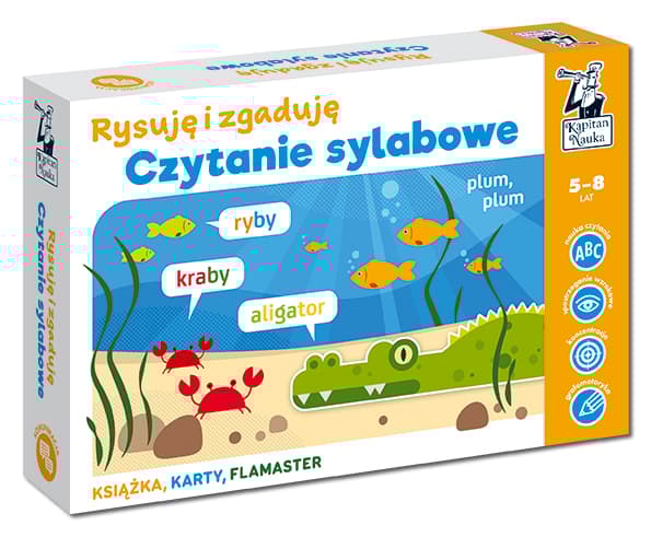 Czytanie sylabowe (5–8 lat) to zestaw edukacyjny (książka + karty) z bestsellerowej serii Rysuję i zgaduję zawierający aż 100 zabaw dla dzieci, które rozpoczynają przygodę z czytaniem metodą sylabową. Został przygotowany przez nauczycielkę wychowania przedszkolnego i neurologopedę Monikę Sobkowiak. Zawiera zabawy pozwalające czytać proste i trudniejsze wyrazy składające się z sylab otwartych i zamkniętych. Ćwiczenia mają formę rebusów, zagadek logicznych, wykreślanek i kolorowanek, tak aby nauka czytania sylabami odbywała się przez zabawę. Książka zawiera również wskazówki, jak sprawdzić gotowość dziecka do nauki czytania, dlaczego warto wybrać metodę sylabową oraz jakich błędów unikać, by zabawa wspomagała zdobywanie nowej umiejętności. Zabawy z sylabami motywujące do nauki czytania Zestaw zabaw Czytanie sylabowe zawiera różnorodne zadania doskonalące znajomość samogłosek i umiejętność czytania wyrazów, m.in. rozpoznawanie sylab i rysowanie ich po śladzie, wskazywanie przedmiotów, których nazwa rozpoczyna się konkretną sylabą, odczytywanie wyrazów utworzonych z sylab oraz dopasowywania właściwego podpisu do ilustracji. Pakiet zawiera 100 zadań (książka + 30 dwustronnych kart ścieralnych) aktywizujących percepcję i pamięć wzrokową, doskonalących umiejętność analizy i syntezy słuchowej oraz budzących zainteresowanie nauką czytania. Dzięki flamastrowi suchościeralnemu łamigłówki można rozwiązywać wielokrotnie, a dzieci zdobywają złożoną umiejętność czytania dzięki motywującej do nauki metodzie prób i poprawek. W książce (48 str.) znajdują się również praktyczne wskazówki, co służy nauce czytania, na co warto zwrócić uwagę przed rozpoczęciem zabaw z sylabami i jakie aktywności wybierać. Rozwój nauka czytania, spostrzeganie wzrokowe, koncentracja, grafomotoryka Autorzy Monika Sobkowiak – nauczycielka wychowania przedszkolnego, neurologopeda, autorka artykułów, książek i zabaw dla dzieci. Nieustannie poszukuje kreatywnych rozwiązań edukacyjnych i sposobów na rozwijanie twórczego myślenia u dzieci w wieku przedszkolnym i wczesnoszkolnym. Prowadzi blog Pani Monia, inspirującego nauczycieli do innowacyjnego działania w edukacji. Krzysztof Stręcioch – zajmuje się tworzeniem ilustracji oraz projektowaniem graficznym. Absolwent Akademii Sztuk Pięknych w Katowicach. Jego artystyczny dorobek stale się powiększa. Najbardziej dumny jest z ilustracji do książek dla dzieci. Wolny czas spędza aktywnie, co motywuje i inspiruje go do podejmowania kolejnych twórczych wyzwań. W serii również Gimnastyka języka. Zabawy logopedyczne (3–6 lat) Rysuję i zgaduję z mewą Ewą (3–4 lata) Rysuję i zgaduję z robotem Eliotem (4–5 lat) Rysuję i zgaduję z królikiem Kazikiem (4–5 lat) Rysuję i zgaduję z kangurem Arturem (4–6 lat) Rysuję i zgaduję z koparką Barbarką (5–6 lat) Rysuję i zgaduję. Koncentracja z detektywem Motywem (6–9 lat)