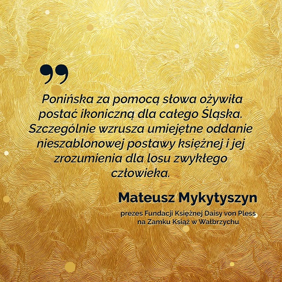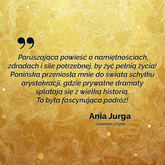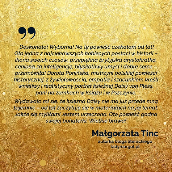 Pacyfistka, feministka, społeczniczka, wybitna polityczka, kobieta wrażliwa na krzywdę słabszych. Tak właśnie można określić księżną Daisy von Pless, jedną z najbarwniejszych i najpopularniejszych postaci swoich czasów. W opozycji do niej - władczy, apodyktyczny, skupiony na armii i budowaniu wojskowej potęgi Prus cesarz Wilhelm II. To nie jest jednak historia miłosna! To niezwykle wrażliwa biografia dwójki z pozoru tak dalekich sobie ludzi, a jednak pałających do siebie nadzwyczajną sympatią, za wszelką cenę próbujących robić swoje mimo przeciwności losu. Dorota Ponińska wdarła się w życie znanych z portretów i opowieści historyków postaci i uczyniła rzecz niezwykłą. W pewien sposób odczarowała dla mnie powieści historyczne, często ciężkie w lekturze, siermiężnie napisane. Przez tę książkę płynie się z nurtem słów i niezauważalnie przesuwa następne kartki. Barwność, jak i mnogość bohaterów, przyprawiają o zawrót głowy. Okoliczności wydarzeń wydają się wręcz namacalne. Daisy była z pewnością kobietą w naszych czasach szalenie potrzebną, taką, jakich rodzi się tylko kilka na stulecie. Choć jej filantropiczne działania były tłamszone na każdym kroku, nie poddawała się i dążyła do postawionego sobie celu. Przez całą lekturę przewija się jakiegoś rodzaju smutek i melancholia. Jakby nie patrzeć idealna na obecną piękną i przygnębiającą jesień. Bo taka właśnie jest ta książka. Jak jesień.