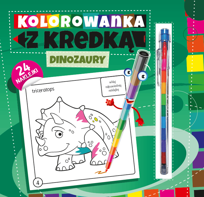 Zawierają dodatkowo 24 naklejki oraz segmentową kredkę z kolorowymi rysikami (11 kolorów).