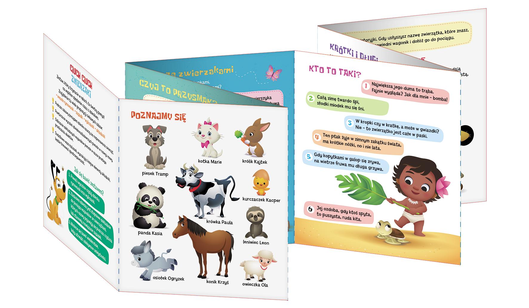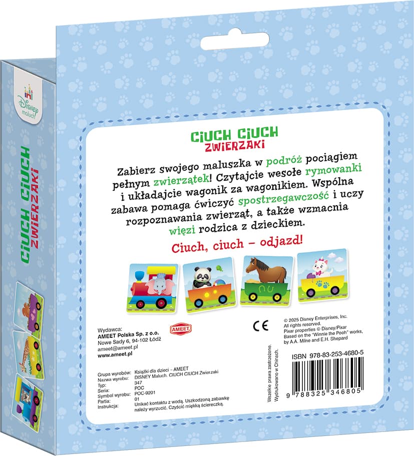 Disney Maluch. CIUCH CIUCH. Zwierzaki Najnowsza propozycja dla maluszków już od 2 roku życia! W zestawie znajdziecie książeczkę z mnóstwem rymowanek, zagadek i wyliczanek oraz 10 dwustronnych kart. Układajcie razem z dzieckiem wagonik za wagonikiem zgodnie ze wskazówkami zawartymi w wierszykach lub całkowicie dowolnie – możecie stworzyć pociąg o długości aż 160 centymetrów! Podczas zabawy maluch uczy się rozpoznawać zwierzęta i ćwiczy spostrzegawczość, a powtarzanie wyrażeń dźwiękonaśladowczych wspiera rozwój jego mowy. To także świetny wstęp do nauki przeliczania obiektów, a dodatkowo okazja do wzmacniania więzi rodzica z dzieckiem. Zestaw jest wykonany z bezpiecznych i przetestowanych materiałów.