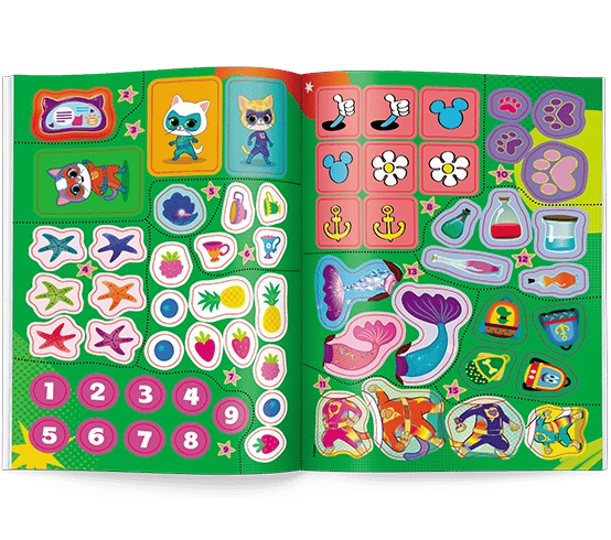 poziom trudności dostosowany do wieku dziecka (4–7 lat), 2 arkusze brokatowych naklejek,