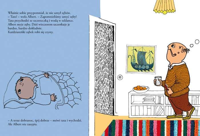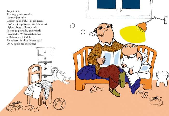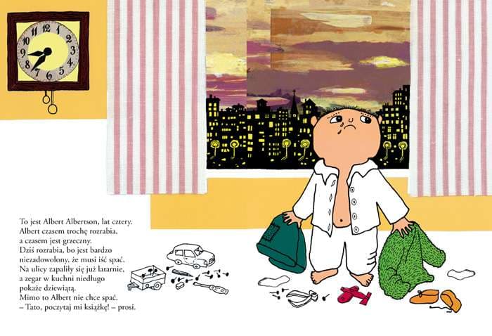 "Albert czasem trochę rozrabia, a czasem jest grzeczny. Dziś rozrabia, bo jest bardzo niezadowolony, że musi iść spać. – Tato, poczytaj mi książkę! – prosi." Fragment książki Albert Albertson to kilkuletni chłopiec, który chodzi do przedszkola i mieszka z bardzo miłym tatą. Dzieci rozpoznają w Albercie swoje zachowania i emocje – radość zabawy, ciekawość świata, nieograniczoną fantazję, ale też złość, zazdrość czy strach. Książki o Albercie, tłumaczone na kilkadziesiąt języków, rozeszły się dotąd w niemal ośmiomilionowym nakładzie w Szwecji i poza jej granicami, a na ich kanwie powstały liczne spektakle teatralne i filmy animowane. W Szwecji to już kultowa seria, licząca około trzydziestu tytułów. Jej autorka i ilustratorka, Gunilla Bergström, otrzymała za swoją twórczość wiele nagród i wyróżnień, włącznie z wyborem jej książki na książkę roku 1997 przez szwedzkie Jury Dziecięce. W 2012 roku mija 40 lat od ukazania się pierwszej historii o Albercie Albertsonie, który w Szwecji nazywa się Alfons Aberg. Jubileusz jest tam hucznie obchodzony, a sprawczyni całego zamieszania, Gunilla Bergström, uhonorowana została przez szwedzki rząd medalem Illis quorum za "nowatorską twórczość literacką i ilustratorską oraz niezwykłą umiejętność przyjmowania dziecięcej perspektywy". Nie mamy wątpliwości, że zaprzyjaźnicie się z Albertem Albertsonem i jego tatą od pierwszego czytania!Szczegółowe informacje na temat książki Dobranoc Albercie Albertsonie