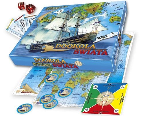 "Dookoła Świata" to interesująca i poznawcza gra planszowa, która pozwoli graczom odbyć pasjonującą podróż dookoła świata przez morza i oceany, odwiedzić wszystkie kontynenty oraz przycumować do głównych portów w różnych zakątkach świata. Gra umożliwia przeprowadzenie rozgrywki na wiele różnych bardziej lub mniej skomplikowanych sposobów, oto jeden z nich. WARIANT 1: Na mapie są zaznaczone cztery drogi podróży. Przed rozpoczęciem gry każdy gracz wybiera swoją trasę. Pierwszy gracz rzuca kostką i przesuwa swój pionek (statek) po linii trasy rozpoczynając od portu w Gdańsku. Ilość kroków jest równa liczbie oczek, która wypadła na kostce. Jeden krok jest równy odległości między kropkami. Analogicznie postępują wszyscy pozostali gracze. Zwycięzcą zostaje gracz, który jako pierwszy dotrze do portu docelowego. Komponenty gry: plansza do gry (mapa świata) - 1 szt., żetony nagrodowe - 75 szt., karty ładunków - 56 szt., mapy nawigacyjne - 4 szt., arkusze ekspedycji - 8 szt., wskaźnik wiatrów - 1 szt., pionki - 4 szt., kostka do gry - 1 szt.
