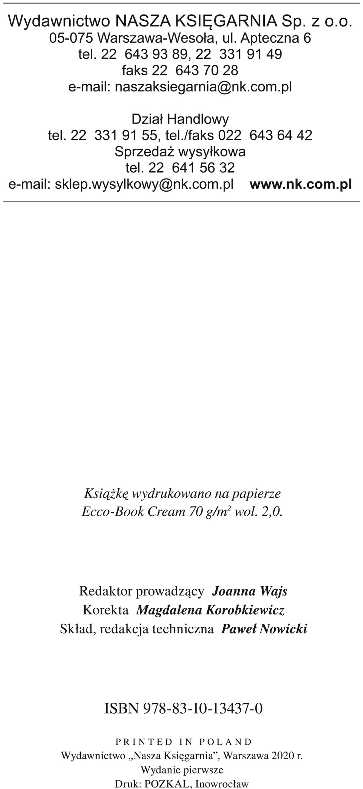 | Podmiot odpowiedzialny: | Wydawnictwo Nasza Księgarnia Ul. Apteczna 6 05-075 Warszawa-Wesoła PL e-mail: [email protected] |