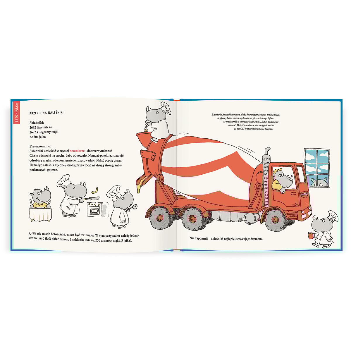 Do czego służy podnośnik, koparka czy kombajn?Tak zabawnie jeszcze nikt tego nie tłumaczył! W tej książce rozbrajające zwierzaki pokażą wam, co potrafią najróżniejsze maszyny. Co tu się dzieje! Krowa obsługuje dźwig, Słonica zmienia wywrotkę w zjeżdżalnię, a Wilk rozrabia minikoparką. Kura i Kaczka sprawdzają, kto ma większą kosiarkę,a w betoniarce miesza się… coś pysznego. Mali czytelnicy znajdą tu zabawne historyjki z udziałem prawdziwych maszyn i pojazdów – oraz sympatycznych zwierzęcych bohaterów. Każda z nich prezentuje jedno urządzenie w zaskakującej sytuacji – narysowane zgodnie z rzeczywistością i opatrzone zwięzłym, rzetelnym opisem. Obok popularnych maszyn, takich jak dźwig czy koparka, znalazły się też te mniej oczywiste, jak podnośnik koszowy czy wóz bramowy. Humorystyczne scenki z lekkością wprowadzą najmłodszych w świat techniki, a przy tym dostarczą im mnóstwo zabawy i zainspirują do wymyślania własnych historyjek i twórczych zastosowań różnych urządzeń. W tej samej serii polecamy również książkę „Młotek, piła i wiertarka. Owca i jej przyjaciele budują dom”, w której sympatyczne zwierzęta pokazują krok po kroku, jak buduje się dom – od fundamentów aż po dach.Szczegółowe informacje na temat książki Dźwig, koparka, betoniarka