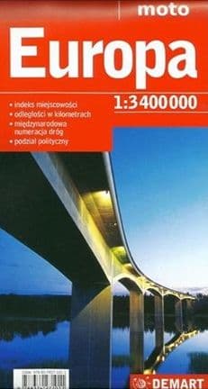 Mapa samochodowa Europy uwzględniająca podział polityczny, międzynarodową numerację dróg, kilometraż.