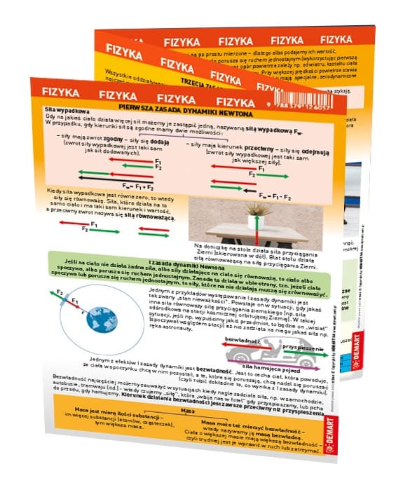 Fizyka - laminowana, składana, trzykartkowa ściągawka - pomoc na lekcji, podczas odrabiania pracy domowej, a także w przygotowaniach do sprawdzianu. Zawiera omówienie trzech zasad dynamiki Newtona, prawo Pascala i prawo Archimedesa.
