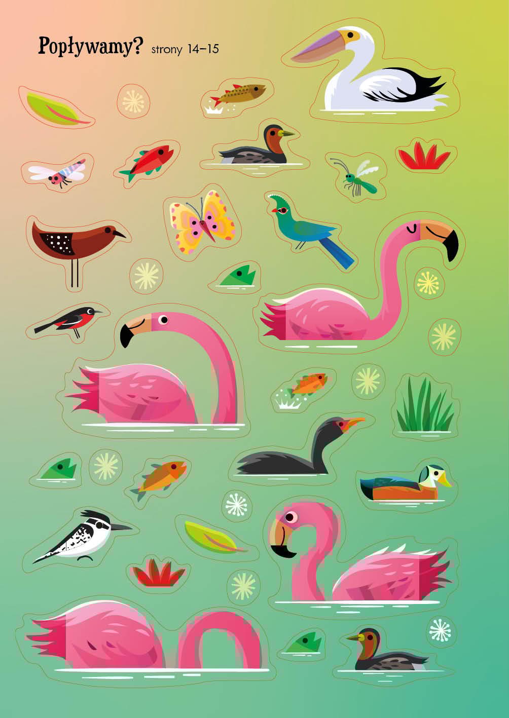 Wypełnij stronę wspaniałym stadem flamingów. Ozdób ilustracje pięknymi ptakami, które latają i dbają o swoje dzieci. Dodaj inne gatunki ptaków, owady i kwiaty, aby wypełnić te sceny. W środku znajdziesz ponad 250 naklejek!