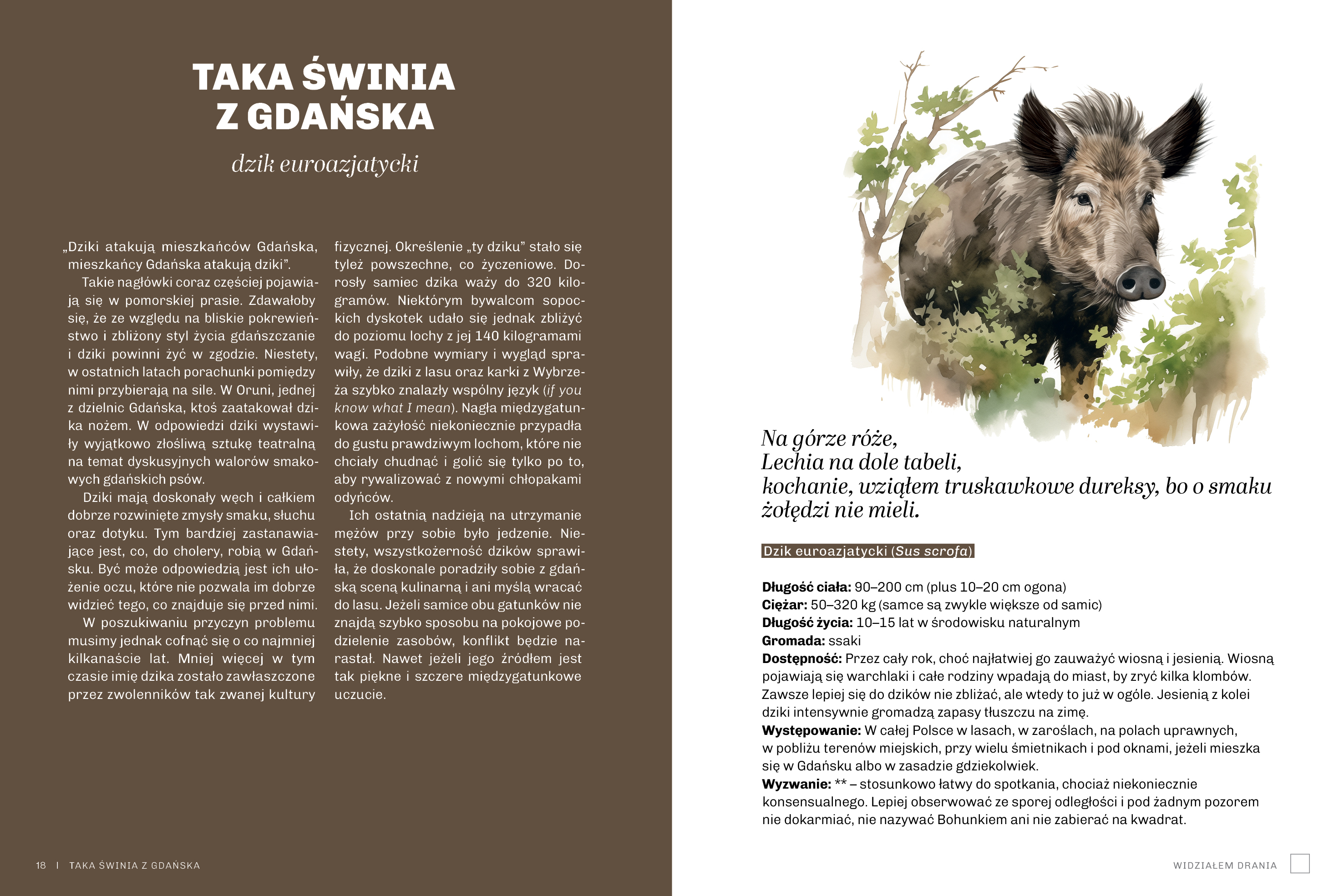 Na łamach tej książki zniesławiono 101 zwierząt, które możecie spotkać na lądzie, w wodzie oraz w waszych koszmarach. To tytuł dla miłośników fauny, którzy wiedzą, że prawdziwe uczucie wymaga wyrzeczeń, a niekiedy również maści na komary, odciski i ból czterech liter, kiedy człowiek słyszy bobra, czuje bobra, ale zobaczyć go za cholerę nie może, bo mu przyroda złośliwie zasłania.