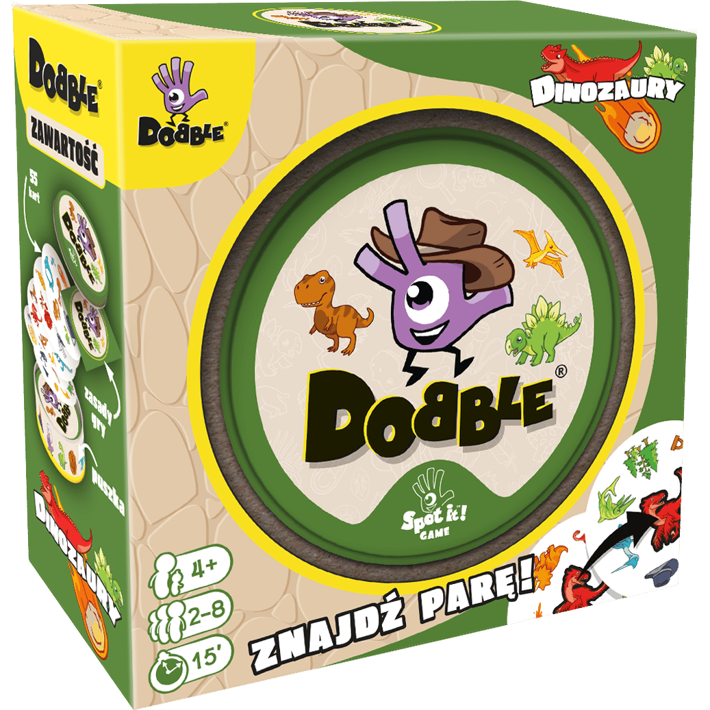 Dobble Dinozaury to gra wspierająca trening spostrzegawczości i szybkości reakcji, w pełni dostosowana do potrzeb najmłodszych. Zestaw zawiera 55 kart z najpopularniejszymi dinozaurami i innymi prehistorycznymi zwierzętami oraz przedmiotami kojarzącymi się z wykopaliskami. Wyraziste, kolorowe obrazki łatwo nazwać, dzięki czemu możemy zaprosić do zabawy dzieci od 4. roku życia.