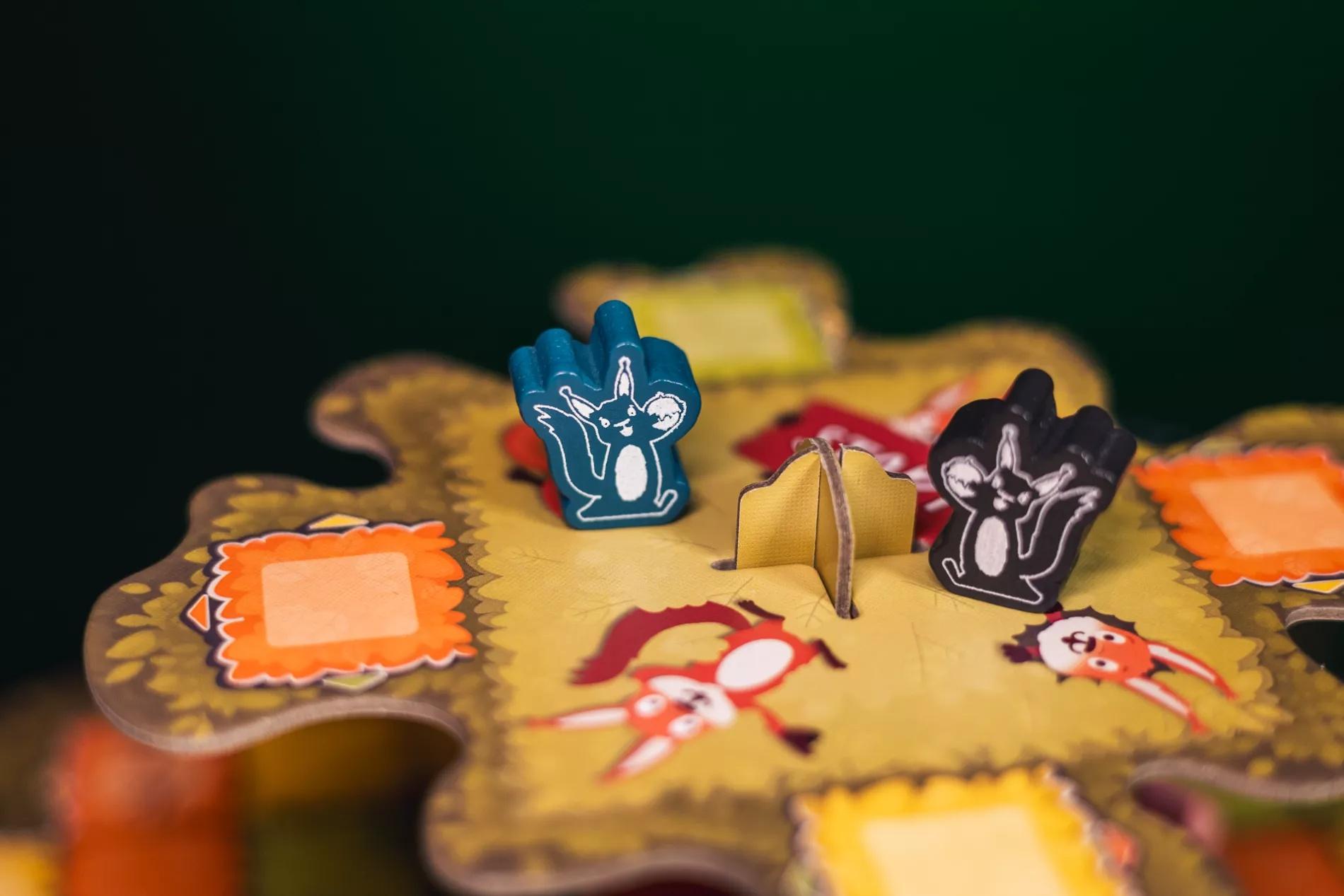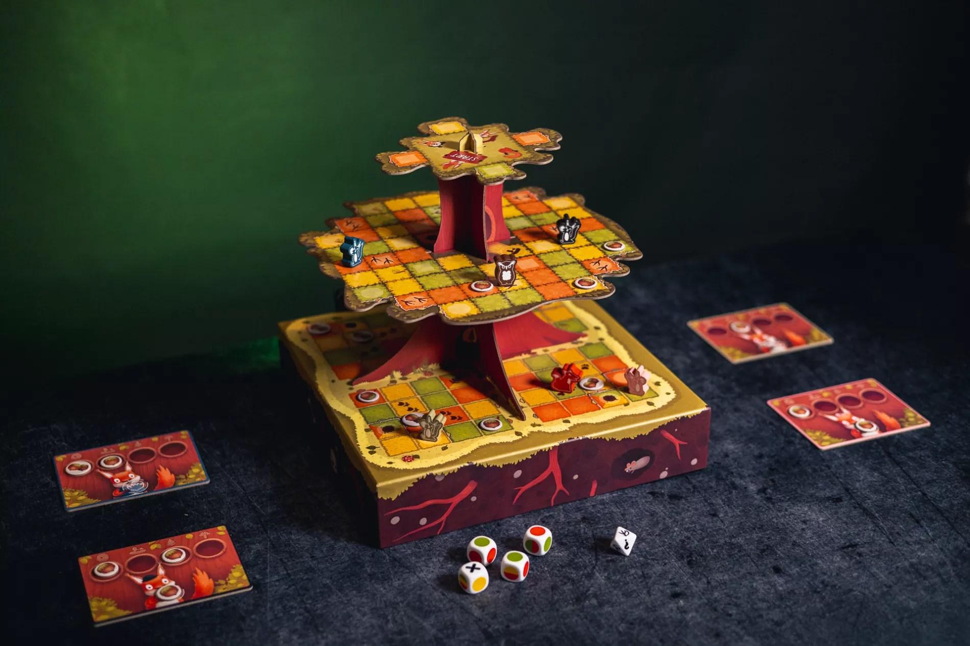 ZAWARTOŚĆ: 1 plansza drzewa (3D), 4 figurki wiewiórek, 1 figurka sowy, 1 figurka lisa, 4 plansze graczy,