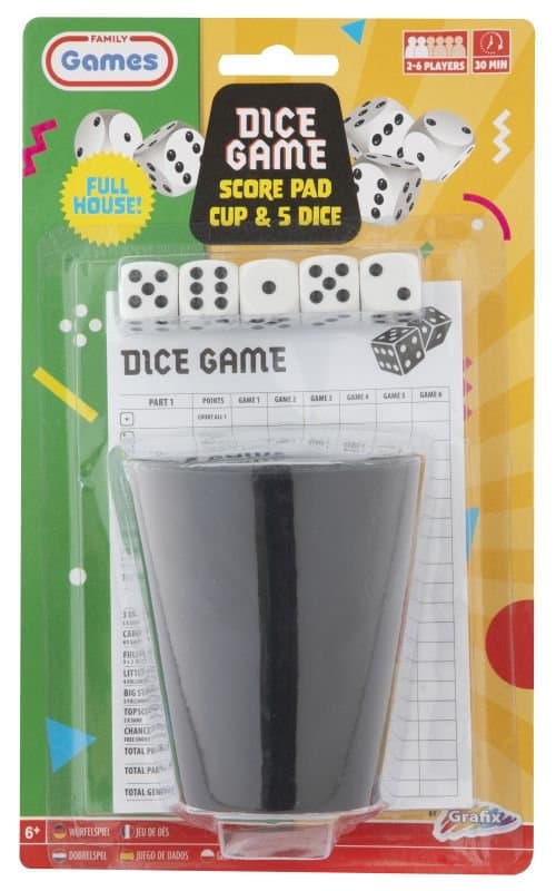 Gra w kości to zabawa dla całej rodziny, w która można zagrać w 2 do 6 osób. W zestawie: podkładka do notowania wyników  kubek wykonany z tworzywa sztucznego i wypełniony jest miękkim materiałem, o wymiarach 8.5 x 7x 4 cm 5 szt. czarno-białych kości Rozgrywka trwa 13 kolejek, w których każdy z graczy ma do dyspozycji trzy rzuty kostkami. Po każdym rzucie gracz może zatrzymać dowolną liczbę kostek i rzucić ponownie resztą. Celem gry jest uzyskanie jak największej liczby punktów za określone układy oczek na kostkach. Produkt odpowiedni dla dzieci powyżej 6 roku życia.