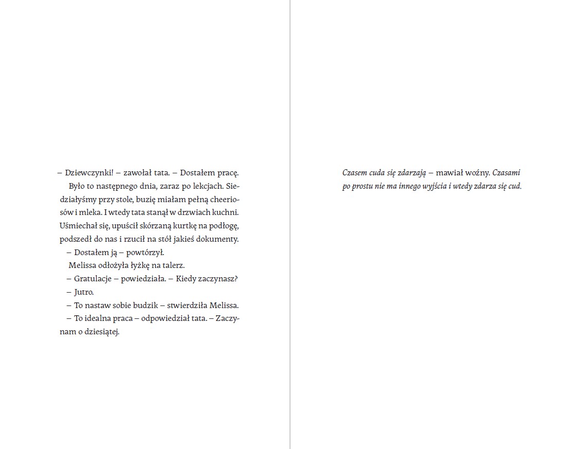 Aby jej zapobiec, siostry podejmują bohaterską i dramatyczną decyzję: będą sprzedawać choinki same. Powieść poruszająco opisuje odpowiedzialność, którą dzieci biorą na siebie w obliczu alkoholizmu rodzica, jednocześnie ukazując, jak w tej walce o przetrwanie i godność pojawia się życzliwość zupełnie nieznajomych osób, która pozwala siostrom utrzymać kruchą nadzieję.