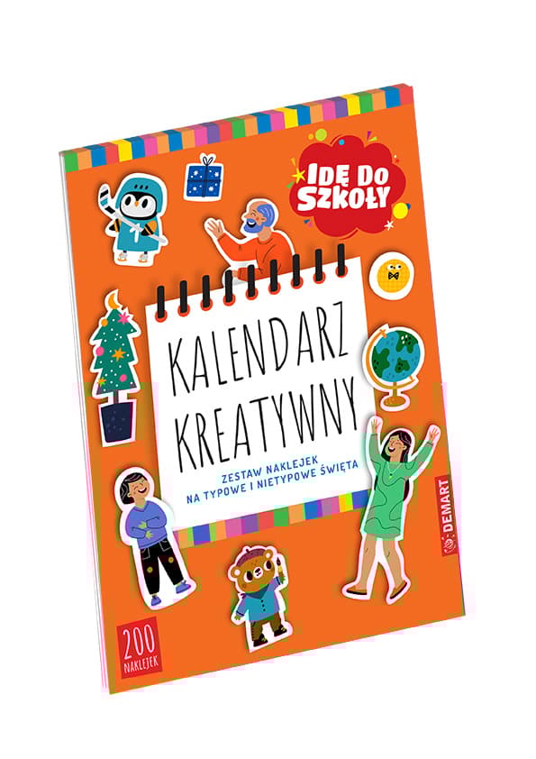 • „Kalendarz kreatywny” to zestaw 32 kart z mnóstwem naklejek do wykorzystania z okazji typowych i nietypowych świąt w ciągu całego roku szkolnego: rozpoczęcia roku szkolnego, Międzynarodowego Dnia Kropki, pierwszego dnia astronomicznej jesieni, zimy, wiosny i lata, Dnia Chłopaka, Światowego Dnia Drzewa, Dnia Edukacji Narodowej, Święta Dyni i Halloween, Dnia Wszystkich Świętych, Narodowego Święta Niepodległości, Światowego Dnia Pluszowego Misia, mikołajek, Bożego Narodzenia, Nowego Roku, Dnia Wiedzy o Pingwinach, Dnia Babci i Dnia Dziadka, Międzynarodowego Dnia Pizzy, tłustego czwartku, walentynek, Światowego Dnia Kota, Dinozaura, Dnia Piegów, Międzynarodowego Dnia Kobiet, Światowego Dnia Zespołu Downa, Międzynarodowego Dnia Teatru, Wielkanocy, Światowego Dnia Świadomości Autyzmu, Światowego Dnia Czekolady, Dnia Ziemi, Dnia Flagi Rzeczpospolitej Polskiej i Narodowego Święta Konstytucji 3 Maja, Międzynarodowego Dnia Strażaka, Światowego Dnia Kosmosu, Dnia Matki i Dnia Ojca, Dnia Dziecka, Dnia Przyjaciela i wakacji.