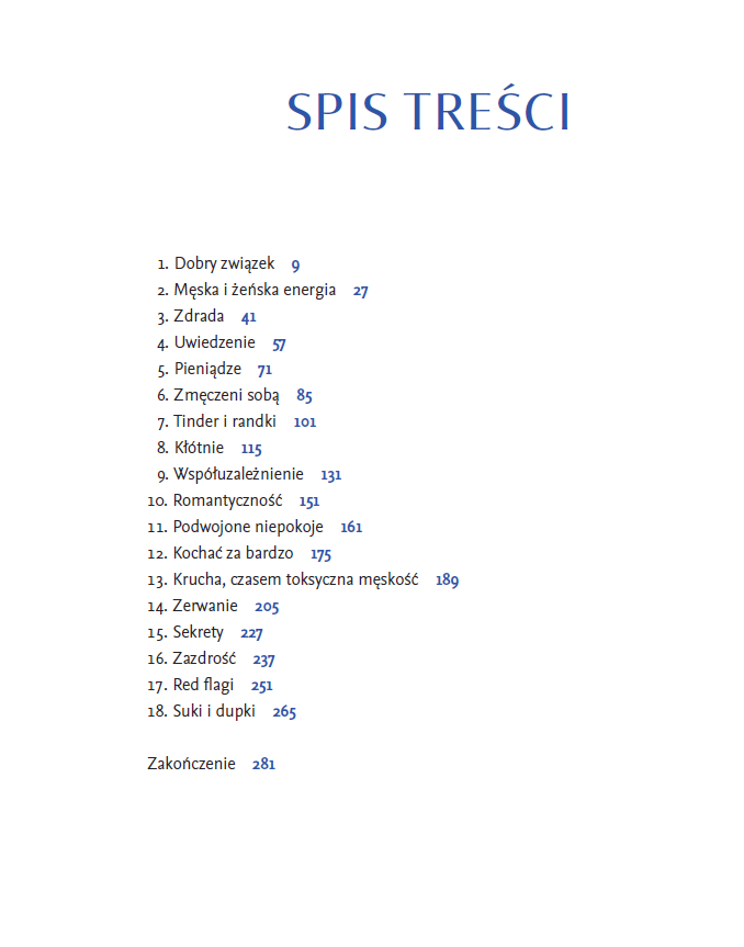 To książka, którą pokocha każdy czytelnik zafascynowany dynamiką miłości i związków w XXI wieku. Piotr Pietucha i Pola Pietucha-Gretkowska stworzyli wyjątkowy poradnik, który łączy lekką narrację w formie rozmowy z faktycznymi treściami terapeutycznymi, stanowiąc doskonałe narzędzie do rozpoczęcia trudnych rozmów w domu. To pozycja obowiązkowa dla tych, którzy chcą mądrze się zakochiwać i czerpać dobrą naukę na przyszłość z nieuniknionych porażek sercowych. Książka promuje ideę mądrego kochania, bazującego na świadomości własnych potrzeb i umiejętności rozpoznawania sygnałów ostrzegawczych w miłości.