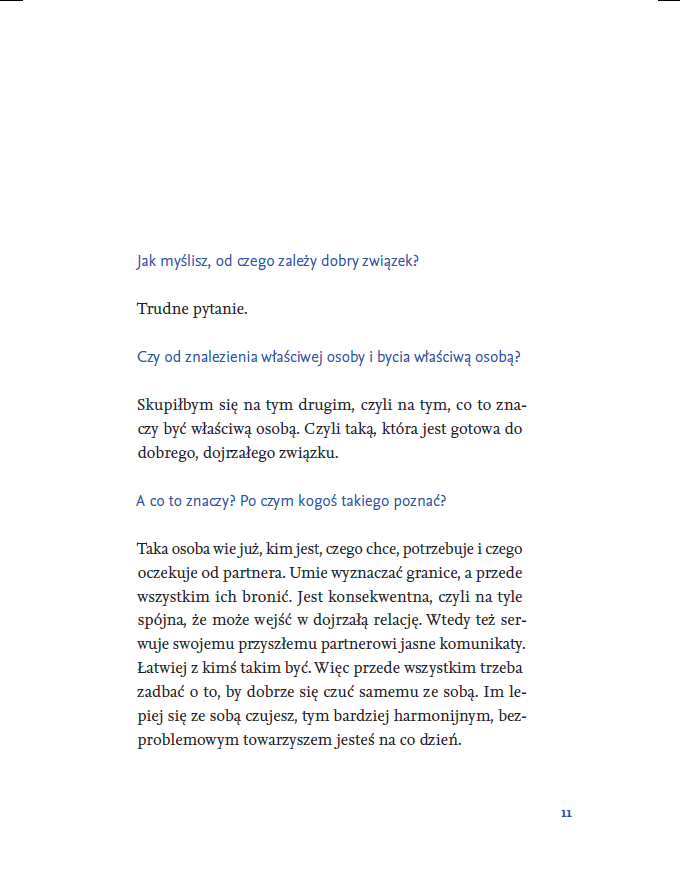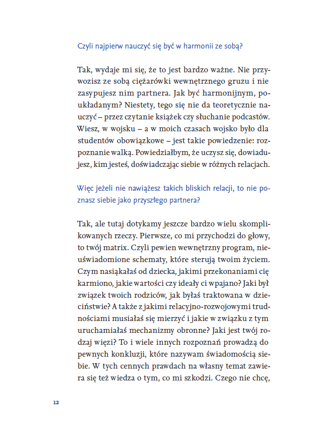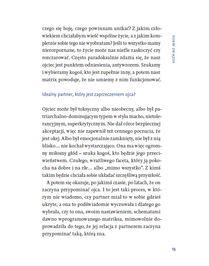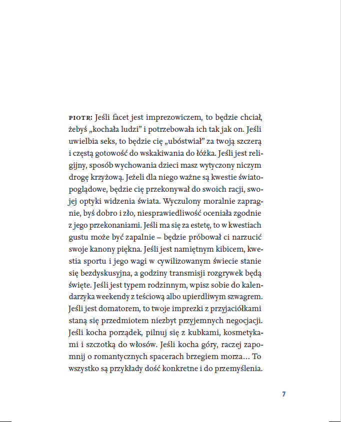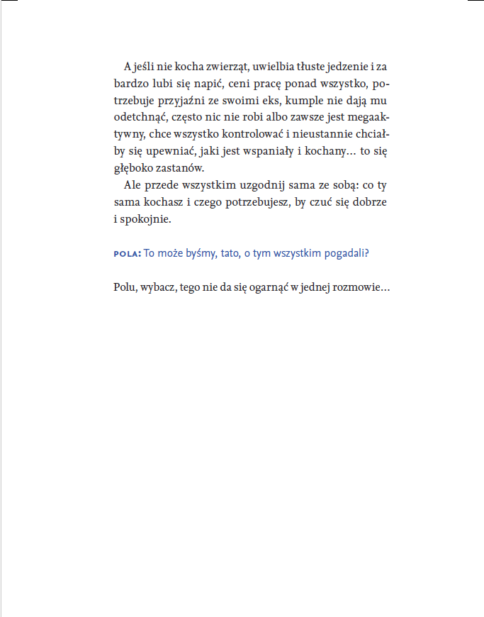 Książka stanowi zapis wyjątkowego dialogu pokoleń – intymnej rozmowy między ojcem a córką. To perspektywa, w której swoboda i ciekawość młodego pokolenia spotykają się z wiedzą i doświadczeniem terapeuty. Pola Pietucha-Gretkowska zadaje Piotrowi Pietusze, doświadczonemu terapeucie i publicyście pytania, które nurtują pewnie każdego. Nie ma tu oceniania, a rozmowy charakteryzuje prosta szczerość. Piotr Pietucha wypowiada się tak naprawdę w podwójnej roli: jednocześnie specjalisty z wiedzą na temat związków oraz ojca, mężczyzny doświadczonego życiowo. Właśnie takich rozmów brakuje w przestrzeni publicznej – na niełatwe tematy, ale prowadzonych prosto, na luzie, otwarcie.