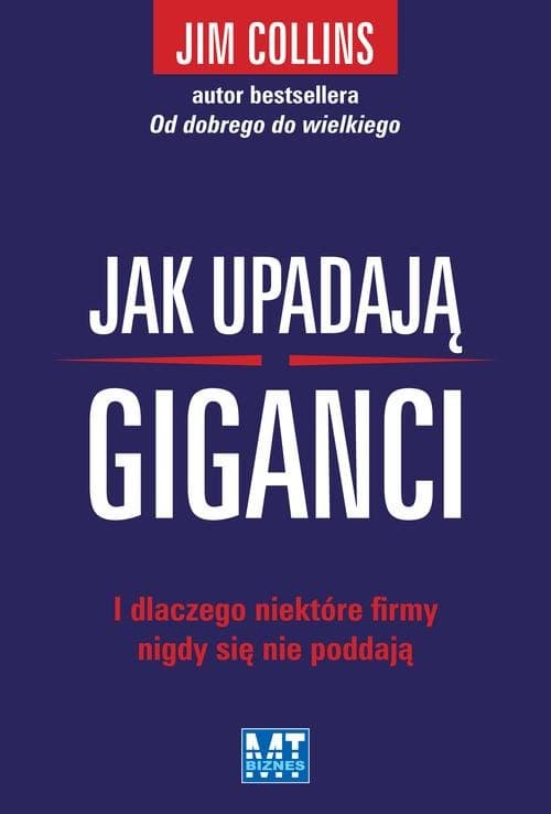 Upadku można uniknąć. Upadek można przewidzieć. Upadkowi można zapobiec. Obserwując ponury krajobraz usiany zgliszczami niegdyś wielkich, a dziś upadłych przedsiębiorstw Jim Collins zaczyna się zastanawiać: Jak to się dzieje, że giganci upadają? Czy upadek można przewidzieć i czy można go uniknąć? Jak nisko musi upaść firma, żeby znaleźć się na drodze prowadzącej nieuchronnie do katastrofy? W jaki sposób może zmienić kurs, na którym się znajduje? W książce „Jak upadają giganci” Collins szuka odpowiedzi na te pytania, dając przywódcom firm opartą na solidnych podstawach nadzieję, że mogą się nauczyć zapobiegać upadkom i odwracać niekorzystny bieg zdarzeń. W czasie projektu badawczego realizowanego przez cztery lata Collins odkrył pięć etapów zbliżania się do upadku: Etap pierwszy: Pycha będąca wynikiem sukcesu. Etap drugi: Chaotyczne sięganie po więcej. Etap trzeci: Negowanie ryzyka i zagrożenia. Etap czwarty: Rozpaczliwe szukanie ratunku. Etap piąty: Odejście w niebyt lub nieistotność. Dzięki zrozumieniu poszczególnych etapów liderzy firm mogą znacznie ograniczyć ryzyko upadku na samo dno. Wybitne firmy potrafią się podnieść nawet po najdotkliwszym upadku. Każda instytucja bez względu na jej wielkość jest narażona na upadek. W przyrodzie nie ma żadnego prawa mówiącego o tym, że najsilniejsi będą tkwili na szczycie w nieskończoność. Każdy może upaść i nieuchronnie do tego dojdzie. Z badań prowadzonych przez Collinsa wynika jednak, że niektóre firmy nawet po osiągnięciu etapu czwartego potrafią się odrodzić, a w pewnych przypadkach stać się nawet silniejsze niż przedtem. Okazuje się, że upadek jest w dużej mierze krzywdą, którą firmy same sobie wyrządzają, a klucz do odrodzenia znajduje się w naszych rękach. Nie jesteśmy zakładnikami okoliczności, historii ani nawet dotkliwych porażek poniesionych w drodze na szczyt. Nadzieja nie gaśnie, dopóki ostatecznie nie wypadniemy z gry. Giganci upadają, ale też często udaje im się powstać z kolan. Jim Collins jest badaczem przedsiębiorstw – wielkich, dobrych, słabych i upadłych – zarówno tych dopiero rozpoczynających działalność, jak i tych chlubiących się stupięćdziesięcioletnią tradycją. Jest autorem bestsellera „Od dobrego do wielkiego” oraz współautorem „Wizjonerskich organizacji”. Naucza przywódców z sektora korporacyjnego i społecznego. O jego dokonaniach pisano w „Fortune”, „BusinessWeek”, „The Economist”, „USA Today” i „Harvard Business Review”.