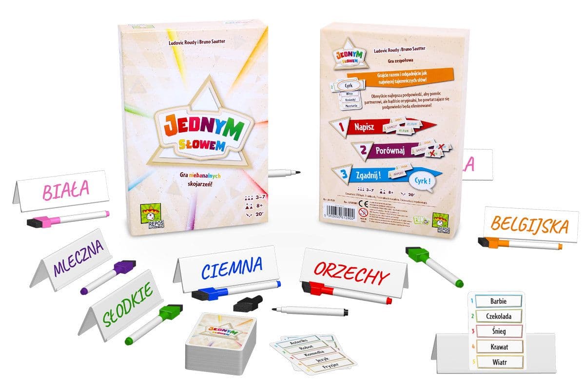 Gra niebanalnych skojarzeń! Jak przekazać komuś podpowiedź, aby była ona trafna, niepowtarzalna i na dodatek złożona tylko z jednego słowa? Już niebawem będzie okazja, żeby się przekonać! Jednym słowem to gra skojarzeniowa oparta na współpracy. Podczas zabawy losowane jest słowo, do którego podpowiedzi będziemy musieli wymyślać. Ale uwaga: każdy z nas będzie mógł użyć tylko jednego słowa! Liczba graczy 3-7 Wiek 8+