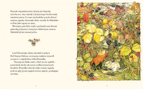 Przyszła wspaniała jesień. Jeżyny już dojrzały, orzechy też, więc myszki z Jeżynowego Grodu miały mnóstwo pracy. Co rano wychodziły na pola zbierać nasiona, jagody i korzonki, by zrobić zapasy. Jesienne przygotowania do zimy zakłóciło nagłe zniknięcie najmniejszej myszki – Prymulki. Gdzie ona się podziała? Co robić? Zrozpaczeni mieszkańcy Jeżynowego Grodu wyruszają w gęste zarośla na poszukiwania bezbronnej myszki… Przeżyj rok w Jeżynowym Grodzie i zbierz wyjątkową kolekcję opowieści: 1. „Wiosna w Jeżynowym Grodzie” 2. „Lato w Jeżynowym Grodzie” 3. „Jesień w Jeżynowym Grodzie” 4. „Zima w Jeżynowym Grodzie” Powyższy opis pochodzi od wydawcy.