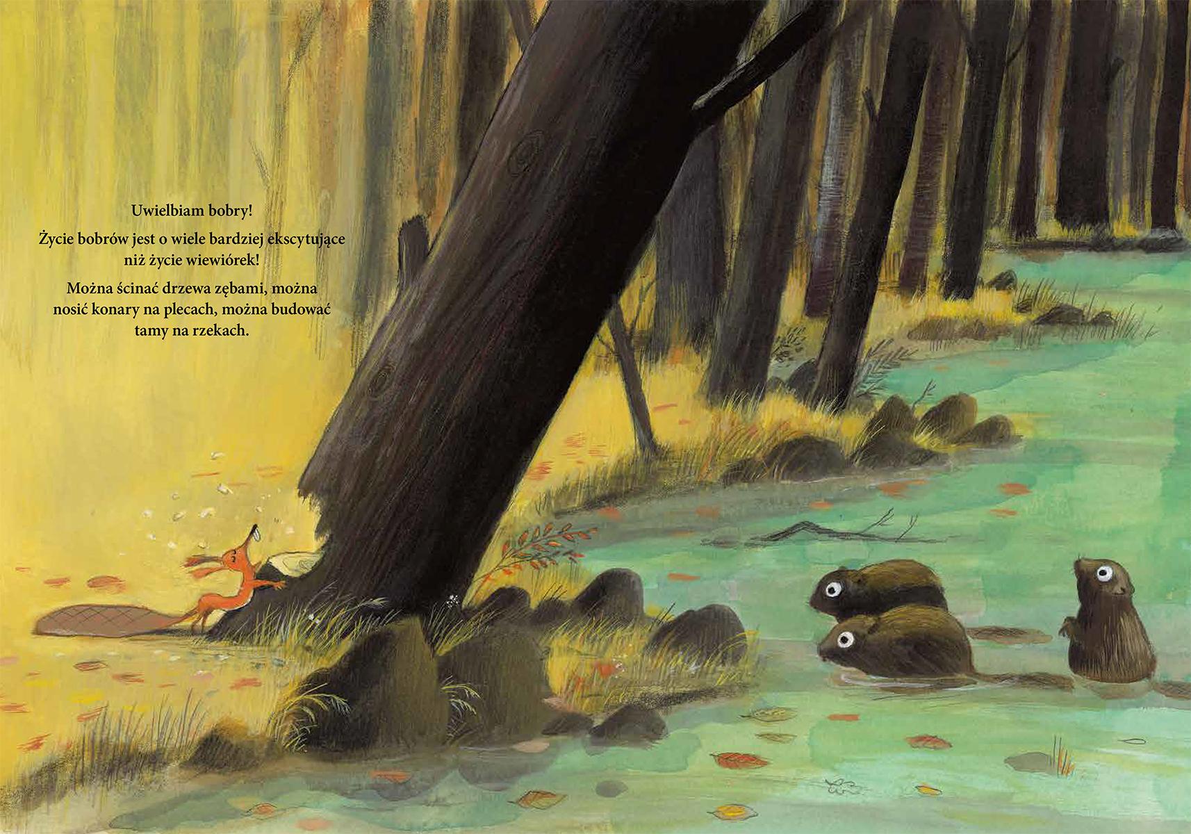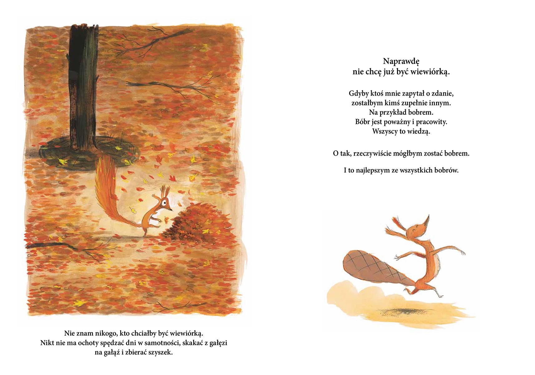 Wiewiórka już nie chce być wiewiórką. Życie bobra, jelenia lub jeża jest z pewnością ciekawsze. Olivier Tallec spełnia wszystkie zachcianki chimerycznego zwierzątka i pozwala mu zaznać życia w innej skórze. Urocza i dowcipna opowieść dla przekornych, którzy wierzą, że gdzie indziej trawa jest bardziej zielona. Kontynuacja serii o wiewiórce znanej z książek „To jest moje drzewo” i „Trochę dużo”.