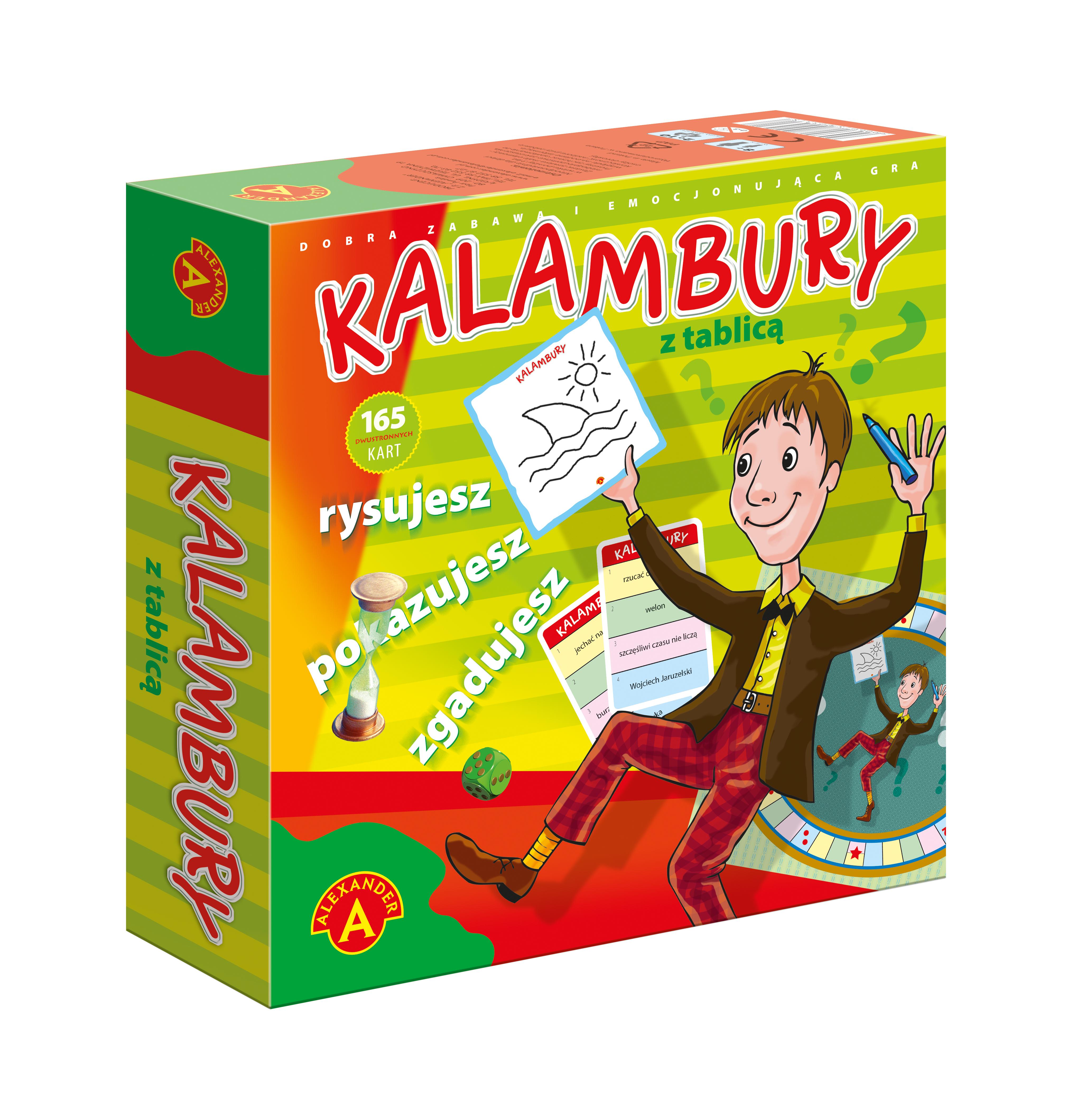 "Kalambury z tablicą" to gra zespołowa, w której należy jak najszybciej zgadnąć (przedstawione za pomocą rysunku na tablicy) hasło wybrane losowo z karty. Przebieg gry tworzy niezwykłą, pełną humoru i wielkich emocji atmosferę rodzinnej zabawy. W tej grze zwyciężają ci, którzy dzięki swej wyobraźni i inteligencji potrafią przedstawić jak najsugestywniej i najsprawniej wylosowane hasło, a także jak najszybciej je odgadnąć. Zawartość opakowania: 163 dwustronne karty haseł, 2 karty kategorii, plansza, 4 pionki, kostka do gry, 80 żetonów, tablica, pisak, gąbka, klepsydra, instrukcja.