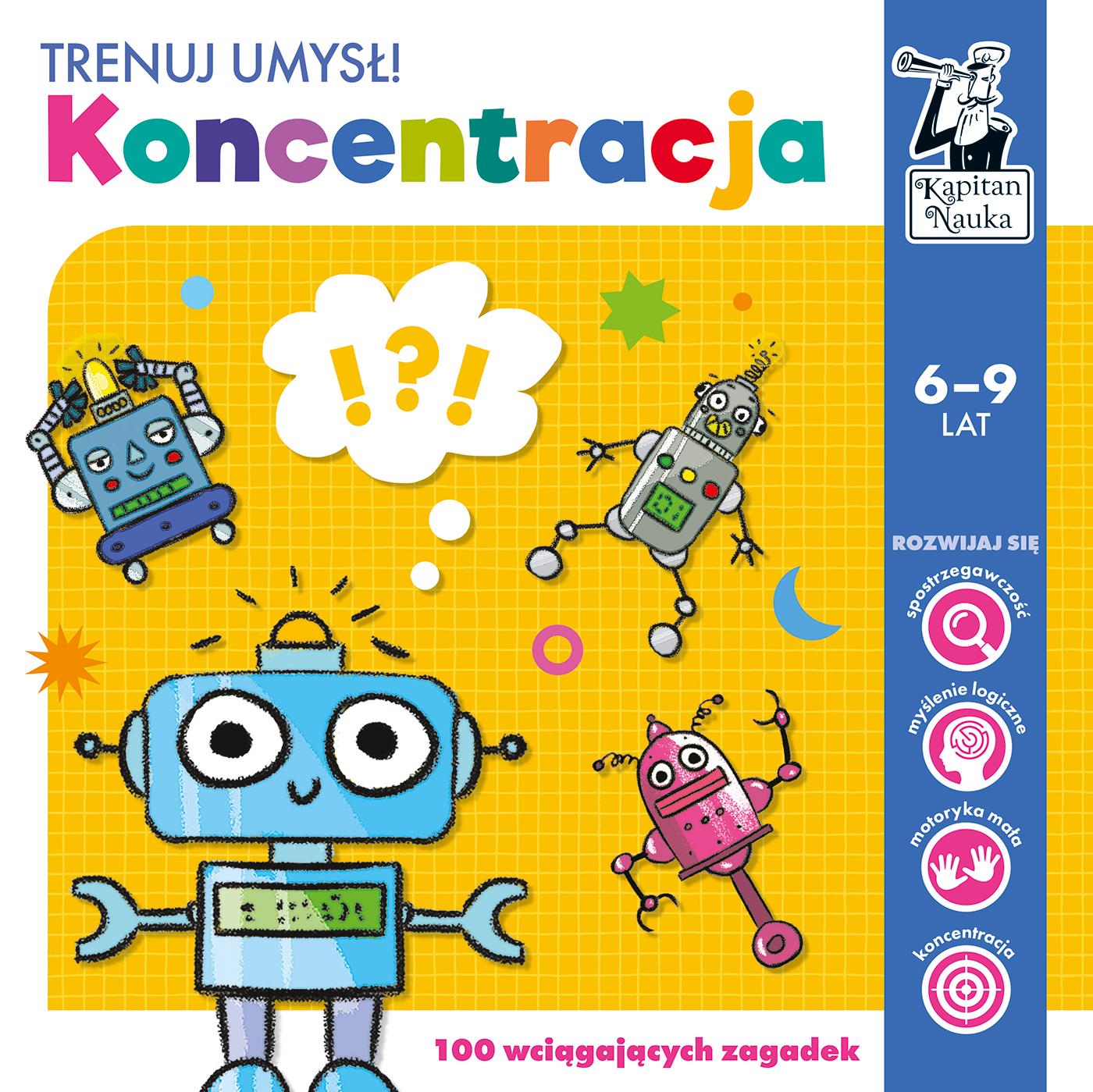 Pakiet „Koncentracja” (6–9 lat) ułatwia dziecku efektywną naukę i eliminuje trudności wczesnoszkolne. Umiejętność skupienia uwagi pozwala szybko przyswajać wiedzę i rozwijać możliwości. Dzięki niej dziecko potrafi się skoncentrować na wykonywanej czynności, pamięta, co zjadło na obiad w szkole albo na co zwracała uwagę nauczycielka pod koniec lekcji. Umiejętność koncentracji uwagi pomaga przetwarzać i selekcjonować informacje, czyli np. lepiej rozumieć nowy materiał i planować proces samodzielnej nauki. Umiejętność koncentracji uwagi sprzyja efektywnej nauce „Koncentracja” to zestaw zagadek obrazkowych do rozwiązywania kredkami oraz mazakiem suchościeralnym. Zadania zostały opracowane przez ekspertki w zakresie rozwoju kompetencji poznawczych w taki sposób, żeby zapewnić wiele godzin twórczej rozrywki. W książce (48 str.) znajduje się ponad 40 zabaw polegających m.in. na wyszukiwaniu różnic i podobieństw, odgadywaniu szyfrów, uzupełnianiu szeregów, wykreślanek czy krzyżówek. W aktywnym rozwiązywaniu zadań pomagają angażujące uwagę ilustracje Sary Olszewskiej, przygotowane z myślą o uczniach edukacji początkowej i dostosowane do ich możliwości percepcyjnych. Na 30 dwustronnych, zmywalnych kartach (60 zabaw) znajdują się zadania wspierające myślenie logiczne, wyobraźnię oraz umiejętności czytania, pisania i liczenia. Flamaster suchościeralny umożliwia wielokrotne rozwiązywanie zagadek. Rozwój: spostrzegawczość, myślenie logiczne, motoryka mała, koncentracja