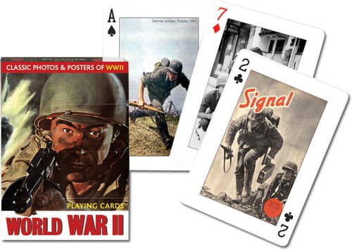 Najwyższej jakości karty do gry renomowanej firmy Ferd. Piatnik & Sohne upamiętniające II wojnę światową. Na wszystkich awersach niezwykłe fotografie i plakaty. Oprócz mini przewodnika w języku angielskim, podpis pod każdym zdjęciem. Talia składa się z 54 plastikowanych kart o wymiarach 63 x 88 mm i gramaturze 310. Idealna zarówno do brydża, pokera, remika jak i innych gier. Wyroby wiedeńskiej fabryki Ferd. Piatnik & Sohne od 1824 roku urzekają bogactwem wzorów i perfekcją wykonania. Jakość i tradycja!