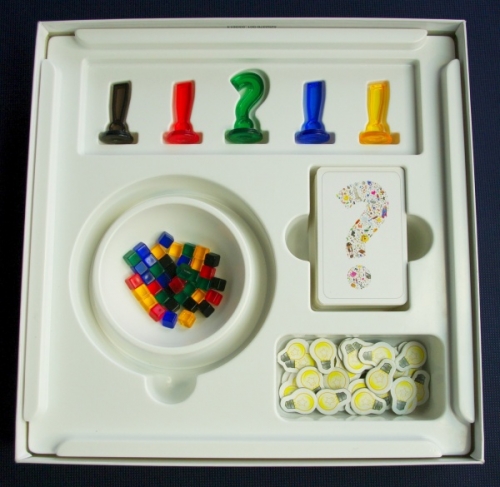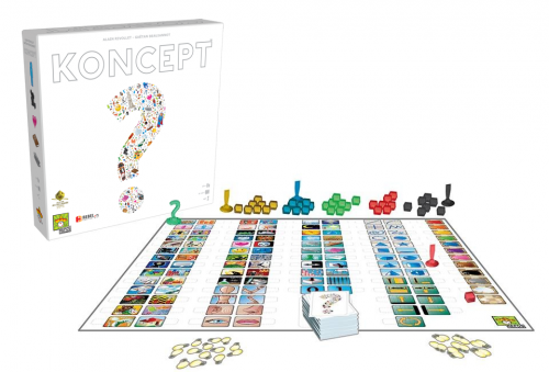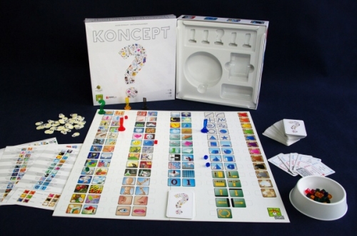 W grze Koncept waszym celem jest odgadywanie haseł pokazywanych przez innych graczy. Ale... pokazujący nie może się odzywać ani nic pokazywać, czy rysować, do dyspozycji ma tylko planszę z różnymi obrazkami i za pomocą znaczników będzie wskazywał te, które będą miały was naprowadzić. "Mężczyzna, człowiek. Jego zawód, związany z walką... Coś więcej? Świat, białe, kółko, czerwone. Hmm, trudne... A, połączył kółko z czerwonym, patrz, przesunął znacznik na ikonie świata bardziej na flagę. Chodzi o flagę! Flagę kraju - biała z czerwonym kółkiem - Japonia! Pilot kamikadze czy samuraj? Przemijanie, czas, cofać się, wcześniej, czyli jednak samuraj!" Gracz ma do dyspozycji jeden główny znacznik, którym wyznacza kategorię główną i używając znaczników pomocniczych dookreśla ją wskazując inne skojarzenia. Jeśli potrzebuje może użyć dodatkowych znaczników w innym kolorze, aby pokazywać inne rzeczy, które mogą naprowadzić na trafne skojarzenie. Koncept jest grą elastyczną i podatną na drobne zmiany i nowinki w zasadach. Zadowolenie graczy jest wartością nadrzędną! W grze mogą się sprawdzić nawet najbardziej szalone pomysły, o ile wszyscy gracze je zrozumieją. Koncept sprawdzi się w każdym towarzystwie, hasła mają 3 poziomy trudności, więc na najłatwiejszym można grać z dziećmi już od 10 roku życia. Do tego na każdej karcie jest 9 haseł, po 3 z każdego poziomu trudności, więc zawsze mamy wybór, a są one tak ułożone, aby każdy znalazł coś dla siebie. Zwycięża gracz, lub jeśli gramy drużynowo - gracze, którzy dzięki odgadnięciu największej ilości haseł zgromadzili najwięcej punktów. Lubisz gry towarzyskie, w których zgaduje się hasła przez pokazywanie, rysowanie i opowiadanie? Koncept to nowy pomysł, którego jeszcze nie było. Zaproś swoich znajomych do tej gry i po raz kolejny bawcie się świetnie wytężając umysł i odnajdując właściwe skojarzenia. Nie zwlekaj, teraz czas na Twój koncept! Liczba graczy: 4 - 12 osób Wiek: od 10 lat Czas gry:nok. 30-40 minut Zawartość pudełka: 1 plansza z symbolami 5 zestawów pionków 1 zielony zestaw składający się z pionka Głównej Kategorii (duży znak zapytania) i 10 kosteczek; 4 zestawy (niebieski, czarny, czerwony, żółty), z których każdy składa się z pionka Podkategorii (wykrzyknik) i 8 kosteczek 110 kart z hasłami; na każdej 9 słów/fraz o trzech poziomach trudności: łatwym, trudnym i mistrzowskim żetony pojedynczych i podwójnych punktów zwycięstwa (podwójne są warte 2 PZ, pojedyncze 1 PZ) 2 pomoce gracza 1 miseczka
