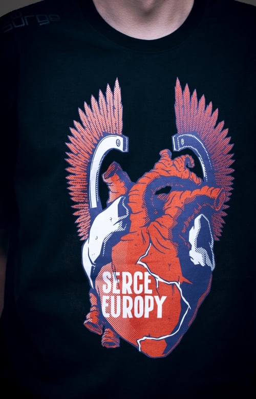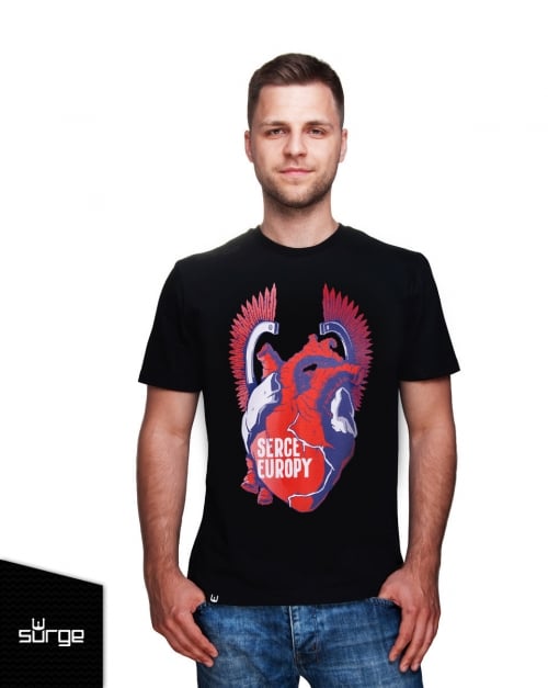 Pozostałe rozmiary: Rozmiar M /  Rozmiar L /  Rozmiar XL Koszulkę „Serce Europy” stworzyliśmy wraz z firmą Surge Polonia, czyli pierwszą na świecie marką, łączącą tematykę patriotyczną z najnowszymi trendami designu. Naszym wspólnym celem, w trakcie projektowania koszulki, było w nieszablonowy sposób promować ideę nowoczesnego patriotyzmu oraz spróbować pokazać, że patriotyzm może być zarówno ciekawy, jak i niezwykle inspirujący. Koszulka odwołuje się do książki Normana Daviesa, „Serce Europy”, w której podróż przez polską historię biegnie ścieżką od czasów najnowszych do epok najbardziej w czasie odległych. Polska w „Sercu Europy” to nie tylko geograficzny środek kontynentu. To miejsce, w którym rytm rozwoju europejskiej cywilizacji jest najlepiej słyszalny. W naszym projekcie staraliśmy odnieść się do tej koncepcji, dodając jednocześnie pióra husarskie, nawiązujące do pięknych kart naszej historii. Koszulka wykonana jest z 100% bawełny czesanej 210 g. Na przodzie, karczku i ramieniu umiejscowiono nadruki. Wielki nadruk z hasłem „Serce Europy” widnieje na piersiach. Na karku znajduje się łatka z tkaniny koszulowej, wzdłuż obwodu potnik z logo Surge Polonia, a u dołu koszulki wszywka żakardowa. Dostępne rozmiary: S, M, L, XL.